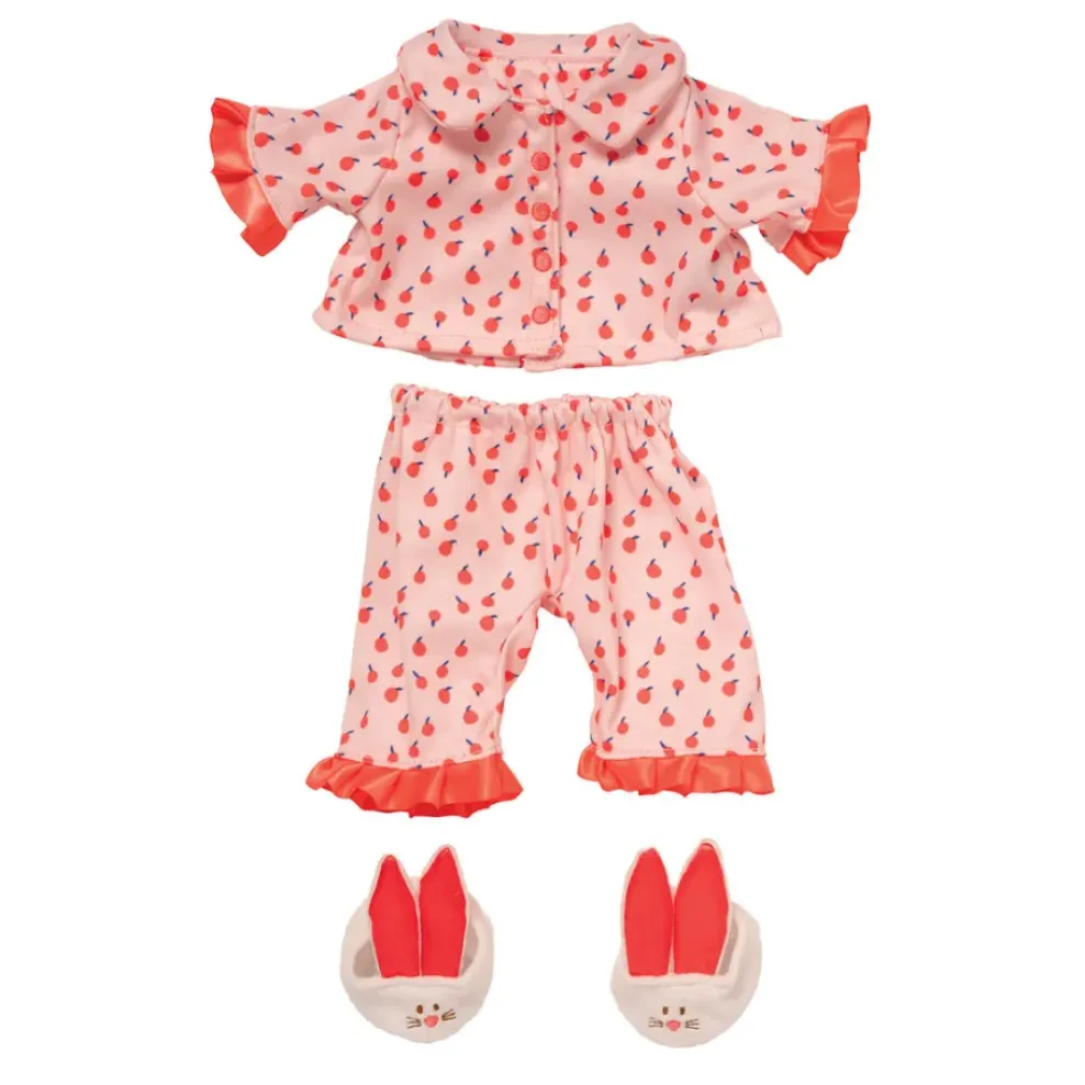 The Cherry Dream 3-piece pajama set from the Baby Stella collection features a matching top and bottom along with bunny ear slippers. This doll clothing set will fit all 15″ Baby Stella dolls, with closures for little hands to easily change.Â