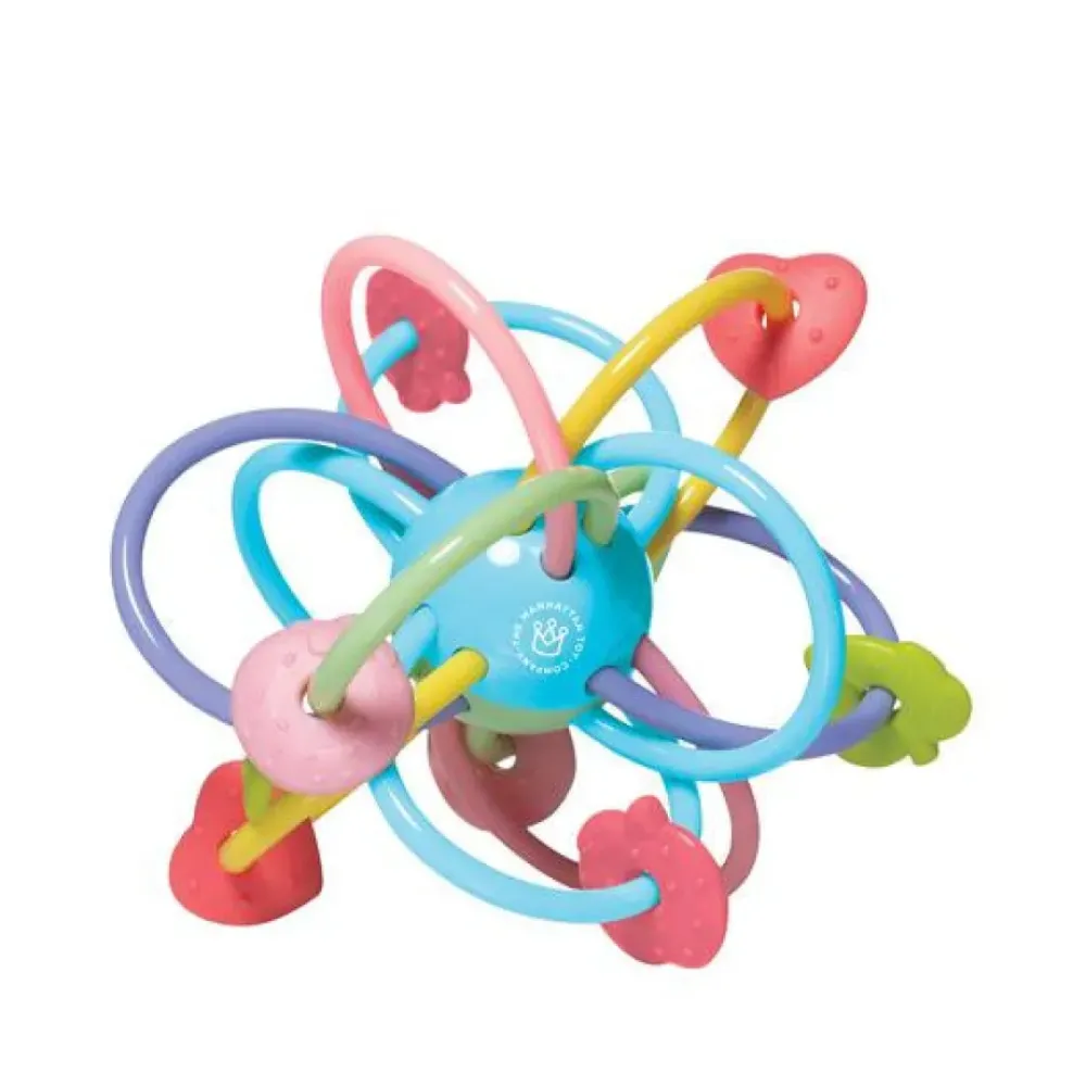 The Manhattan Ball is a rattle and teether for your young teething baby. Its maze of soft, continuous tubes and its stunning colors instantly capture and hold baby’s attention. The mesmerizing loop design and lightweight construction make it very easy for little hands to grab, hold and rattle. A perfect clutching toy to engage baby’s gross motor skills! The center ball features a quiet rattle so baby can explore sound and cause and effect. The soft, pliable loops are BPA-free for teething or gumming babies. Manhattan Ball can also be refrigerated to provide a more soothing experience for particularly sore baby gums and teeth. Colorful shapes are attached to the teething tubes for extra functionality, allowing baby to move them around and teethe on the textured surface of the shapes.