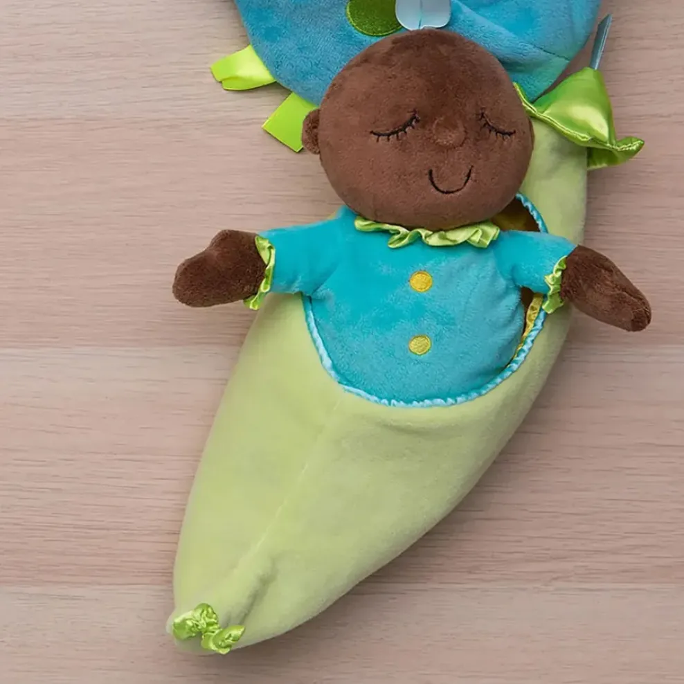 The Sweet Pea Brown Snuggle Pod, hides a sleepy, 8 inch doll inside. Perfect as a first baby doll, Sweet Pea encourages and develops nurturing skills in children. With its thoughtful details, satin-lined interior and velvety soft exterior, sweet pea is sure to be a favorite snuggle pal for years to come. Includes brown doll with a satin hair tuft and embroidered facial and button details. Babies will love toting and tucking in their own adorable first baby doll. Fosters early development of nurturing skills.