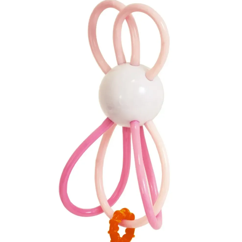 The Zoo Winkels Bunny features the same colorful, chewable, bendable loops as the original, which make it easy for infants to grasp and explore. The appeal of the Winkel teething toy spans and enhances developmental stages including grasping, tracking, mouthing, and throwing. A soft rattle makes it fun to shake, too. Place the Winkel Bunny in the fridge to cool, once chilled offer it up to baby as a cool and soothing teether.