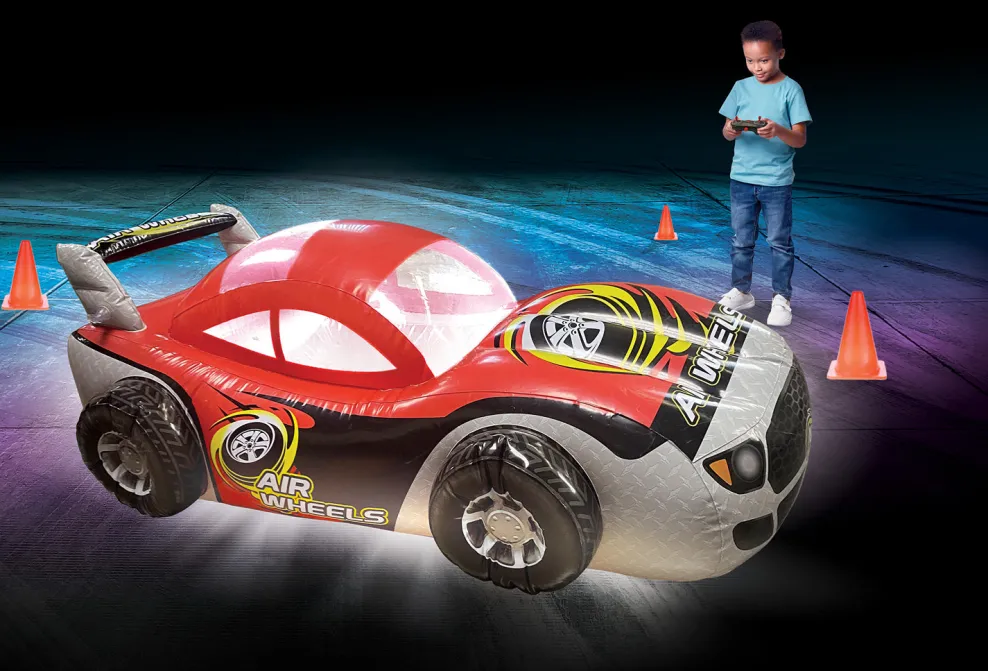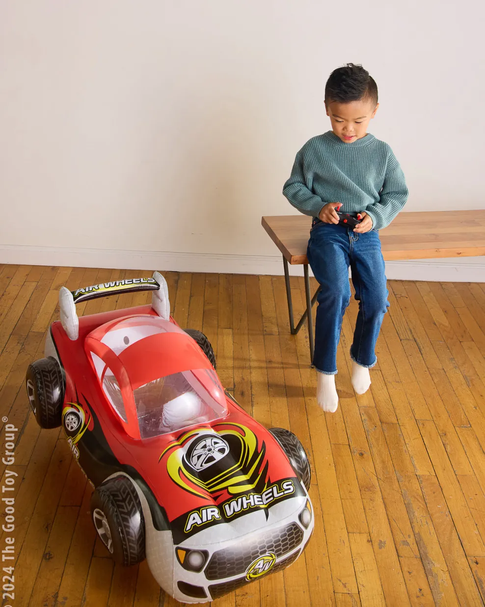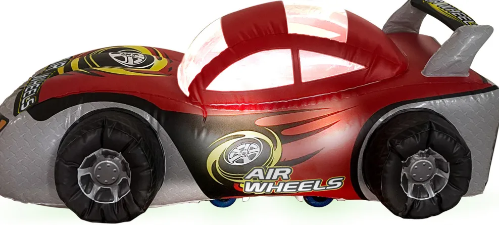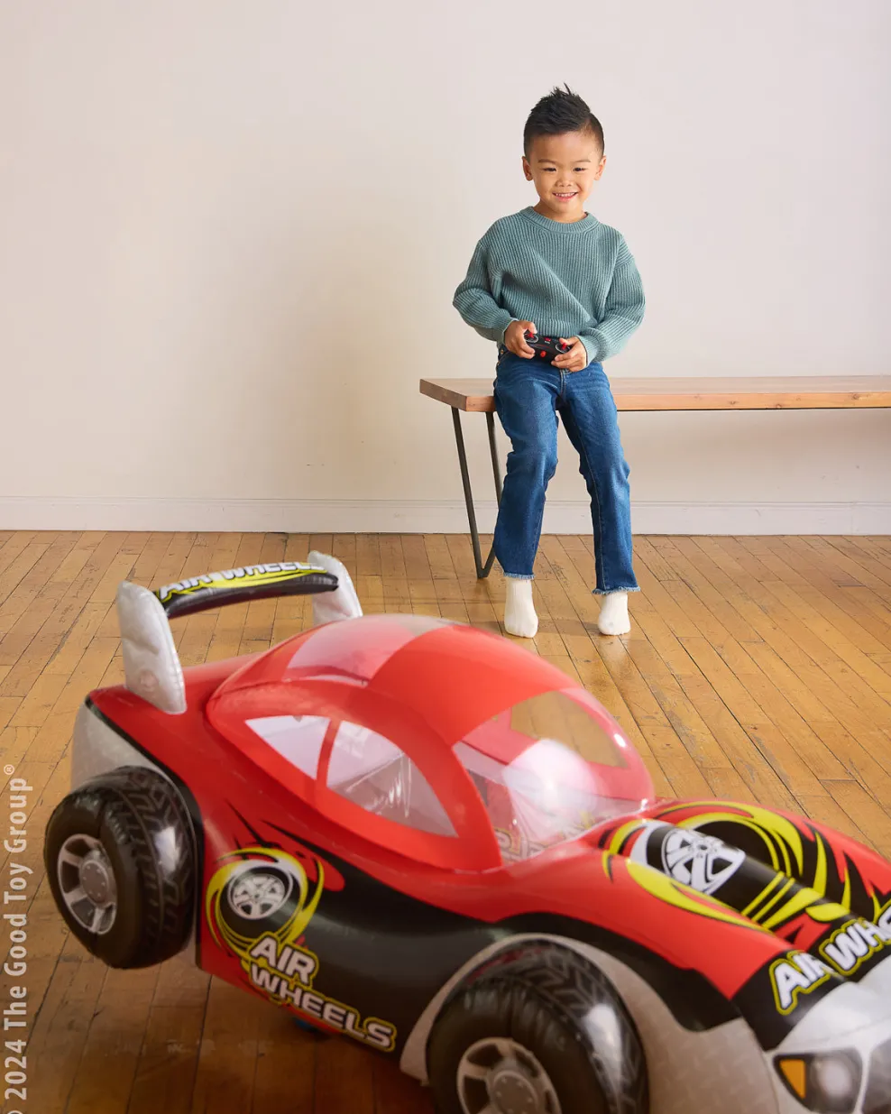 Unleash the thrill of racing with RC Turbo Twister Air Wheels, the giant 36” inflatable RC racecar designed for high-speed fun indoors or outdoors. Equipped with vibrant LED lights, this vehicle illuminates any track, day or night. Inflation is a breeze with the included pump, readying you for action-packed adventures without delay. Durable and crash-resistant, Air Wheels ensures endless excitement without the worry of damage. Whether maneuvering through obstacle courses or speeding down the hallway, RC Turbo Twister Air Wheels delivers an unparalleled racing experience for all ages. Available in Red or Blue.
