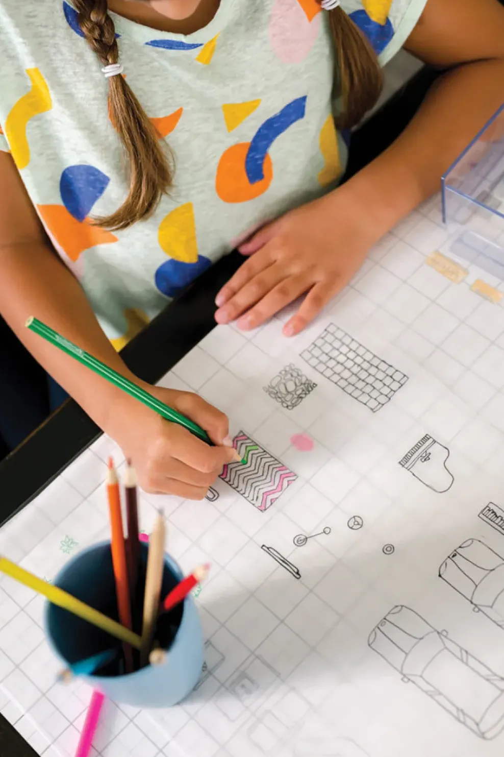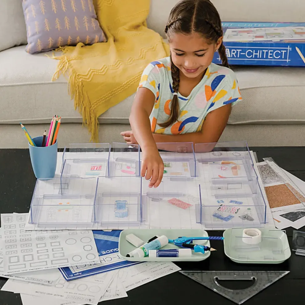 This one-of-a-kind activity teaches aspiring architects and interior designers about drawing, design and architecture while they create their own 3-D home model. Kids learn real drafting skills as they build 3-D designs from the ground up. This introduction to architecture sparks the imagination as kids use real architectural tools like a drafting triangle, compass and more to design, furnish and decorate floor plans using the detailed guidebook, static-cling doors and windows, furniture templates, drafting paper, 18″ x 24″ acrylic work surface, art supplies and more.• Develops fine motor skills and self-confidence• Teaches creative design and professional drawing techniques • Strengthens geometry skills, engages the imagination and encourages an interest in architecture• This kit is complete with everything you need to conceptualize, design and build a 3-D home modelIncludes:• Floor Plan Grid• Base Boards (2)• Walls (36)• Tracing Paper (10 Sheets)• Patterned Paper (4)• Floor Plan Tracing Sheets (5)• Wall Cling Sheets (3)• Dry Erase Marker• Drafting Pencil• Colored Pencils (8)• Eraser• T-Ruler• Drafting Triangle with Protractor• Compass• Glue Dots and Glue Stick