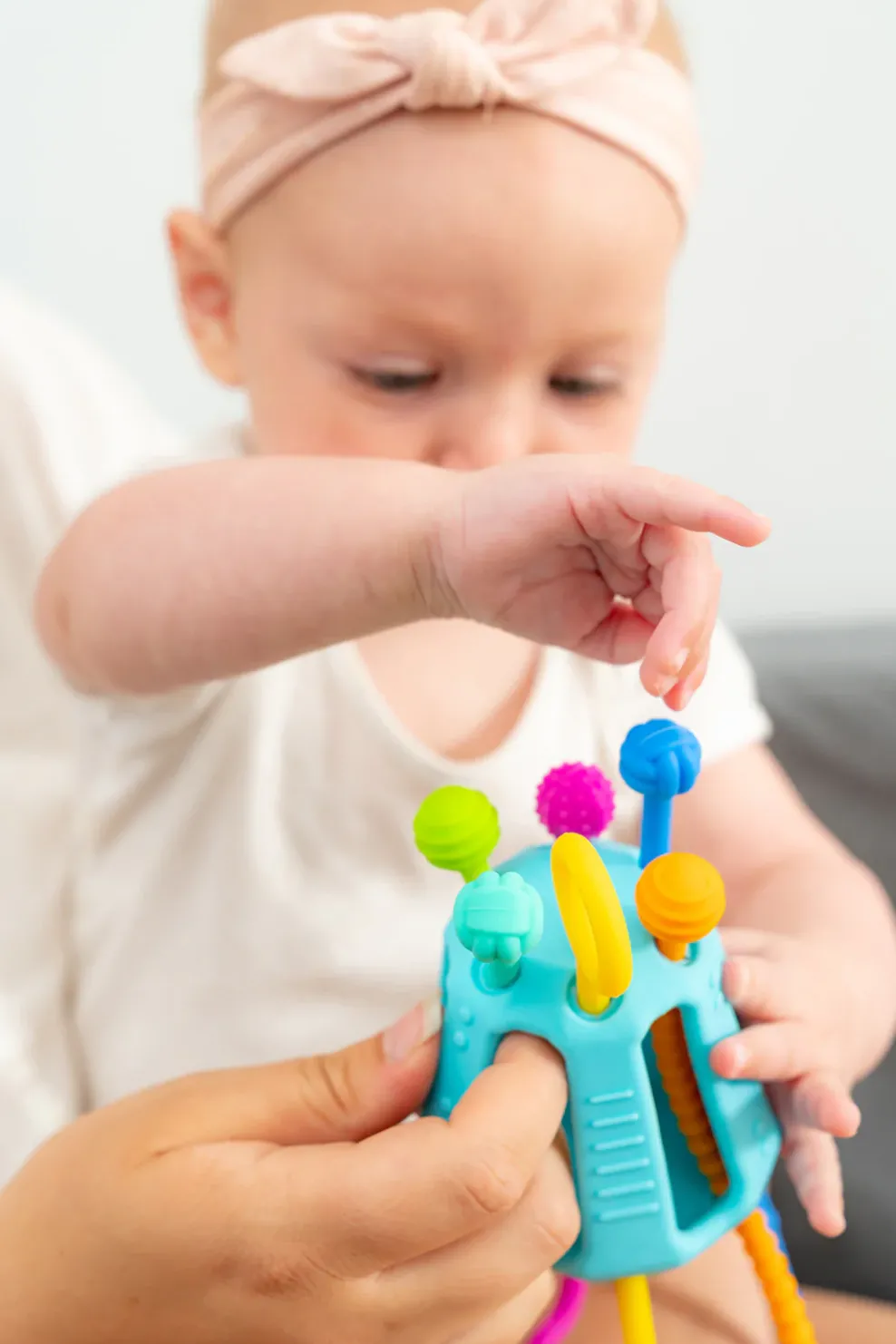 Zippee is a silicone activity toy perfect for 18months+. Little fingers can’t resist Zippee’s flexible, textured cords and easy to hold grips. Babies and toddlers love pulling Zippee’s cords from side to side and hearing and feeling the various sounds and vibrations the cords make.