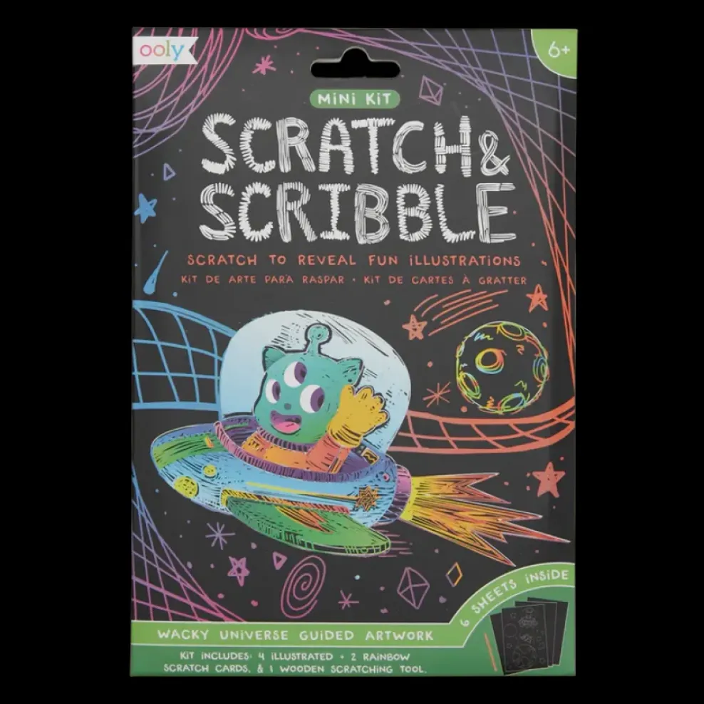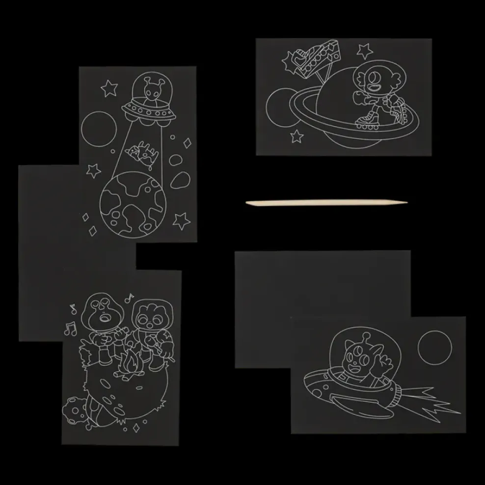 Launch into some imaginative fun with this mini scratch art kit. Included in this scratch art set are a wooden stylus, four adorable alien illustrations, and two blank scratch cards for creating a colorful universe all your own.