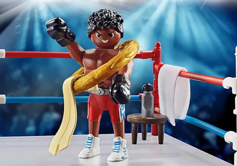 Figures: 1 boxer; Accessories: 1 boxing ring, 1 towel, 2 boxing gloves, 1 stool, 1 drinking bottle, 1 victory wreath