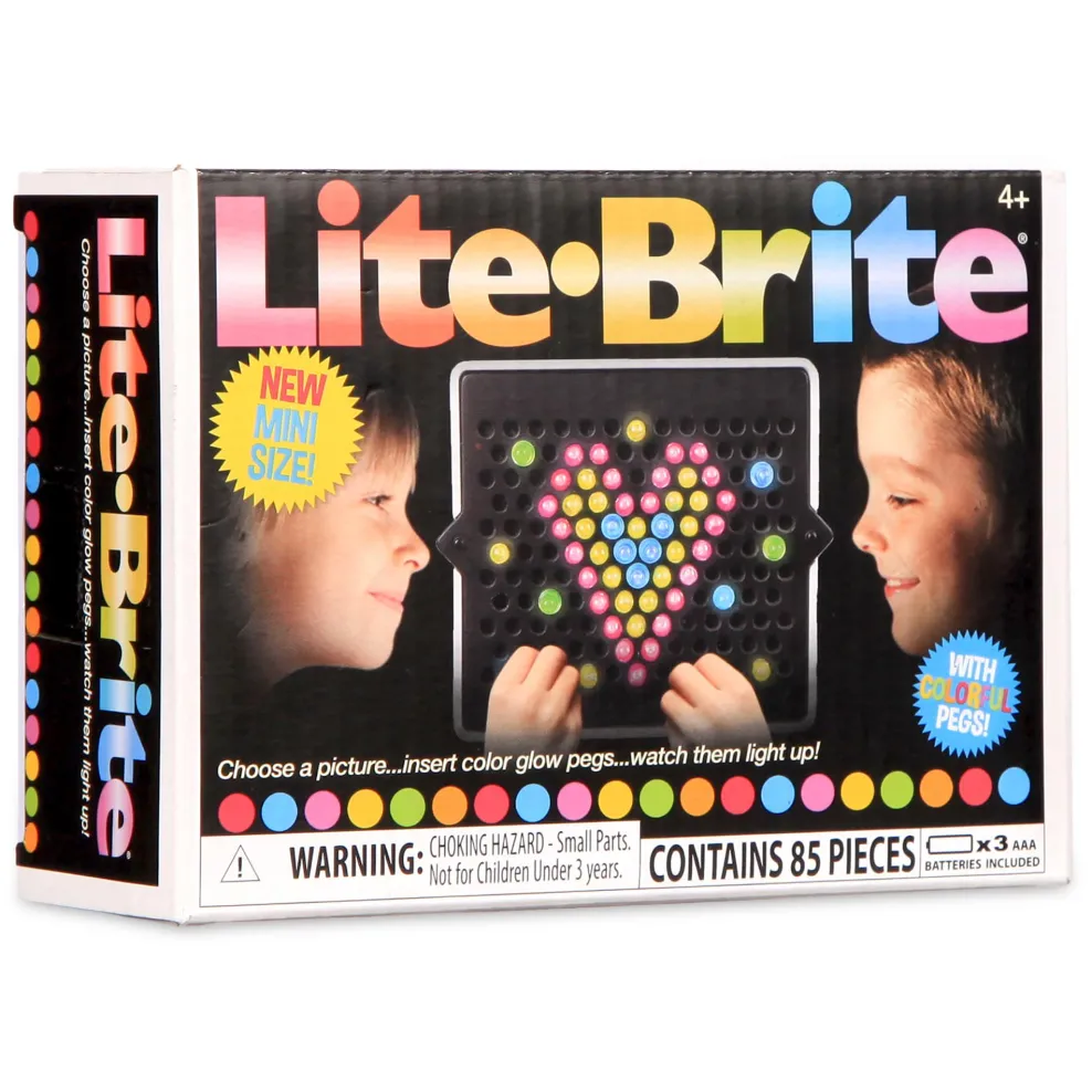 Everyone’s favorite Lite-Brite – now in a mobile miniature form! The Mini Lite Brite has all the creative possibilities of the original, packed into a 3″ board. Beat boredom and explore creativity with a no-mess outlet to create beautiful pictures. Kids can follow the design templates or create their own light-up designs with the multi-colored pegs.