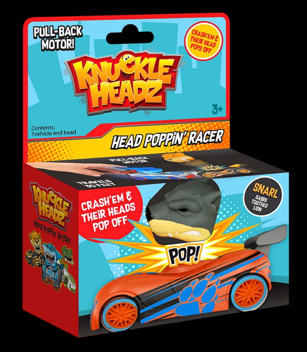 Knuckle-Headz Head Poppin™ Racers are brand new for 2019. Fueled by a powerful pull-back motor, Knuckle-Headz simulates medieval jousting with a few modern twists. Six exciting new collectible characters face off in a battle to see which can keep its head. Define the battlefield, aim your vehicle at your opponents, pull back for maximum momentum, and let them zoom toward each other. Direct hits result in the loser’s head popping off about 12 inches. Reset your spring-loaded characters head and face off again. 6 characters available in single and double packs.