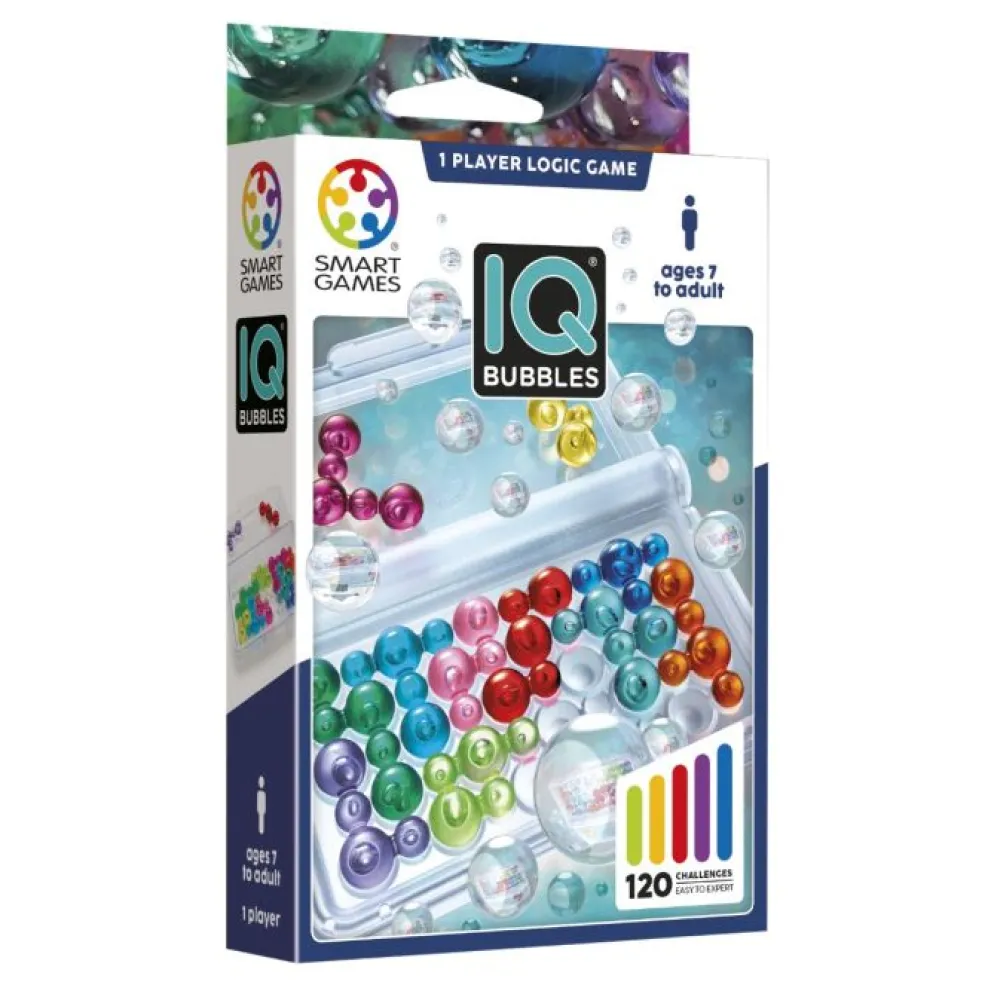 Test your brainpower with IQ Bubbles! This addictive puzzle game challenges players to fit all the colourful, transparent bubble pieces onto the travel-friendly gameboard/case.