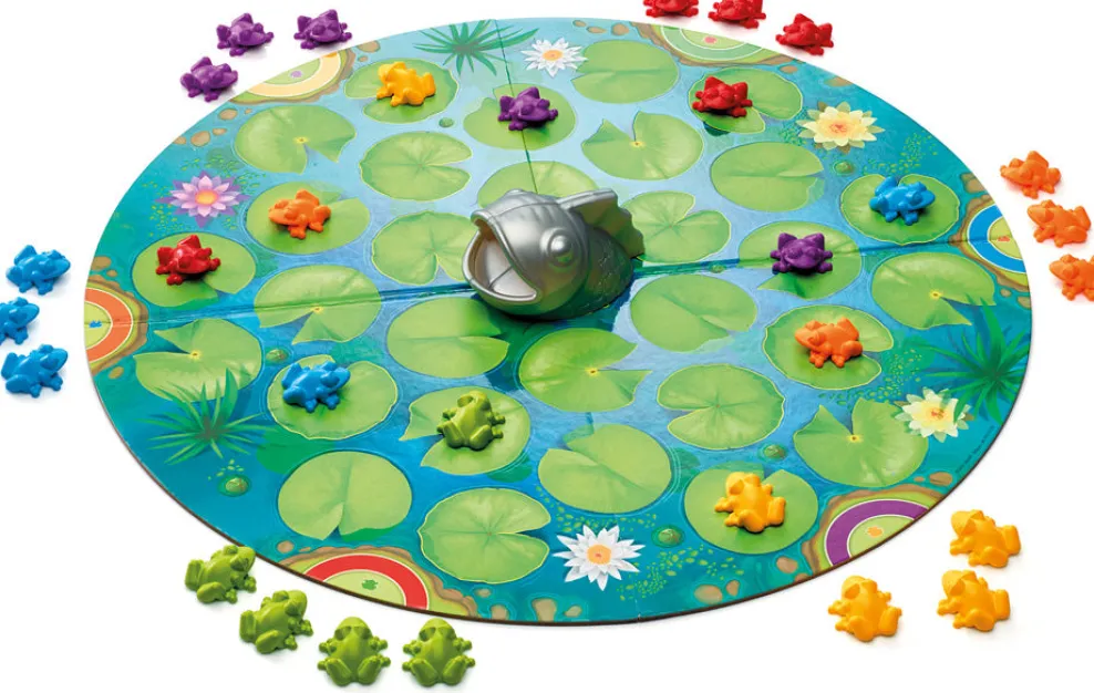 Colorful contents include a game board, 1 fish, 6 sets of 5 soft frogs, and game rules. A quick-play family game that encourages flexible thinking and clever planning. For 2-6 players.