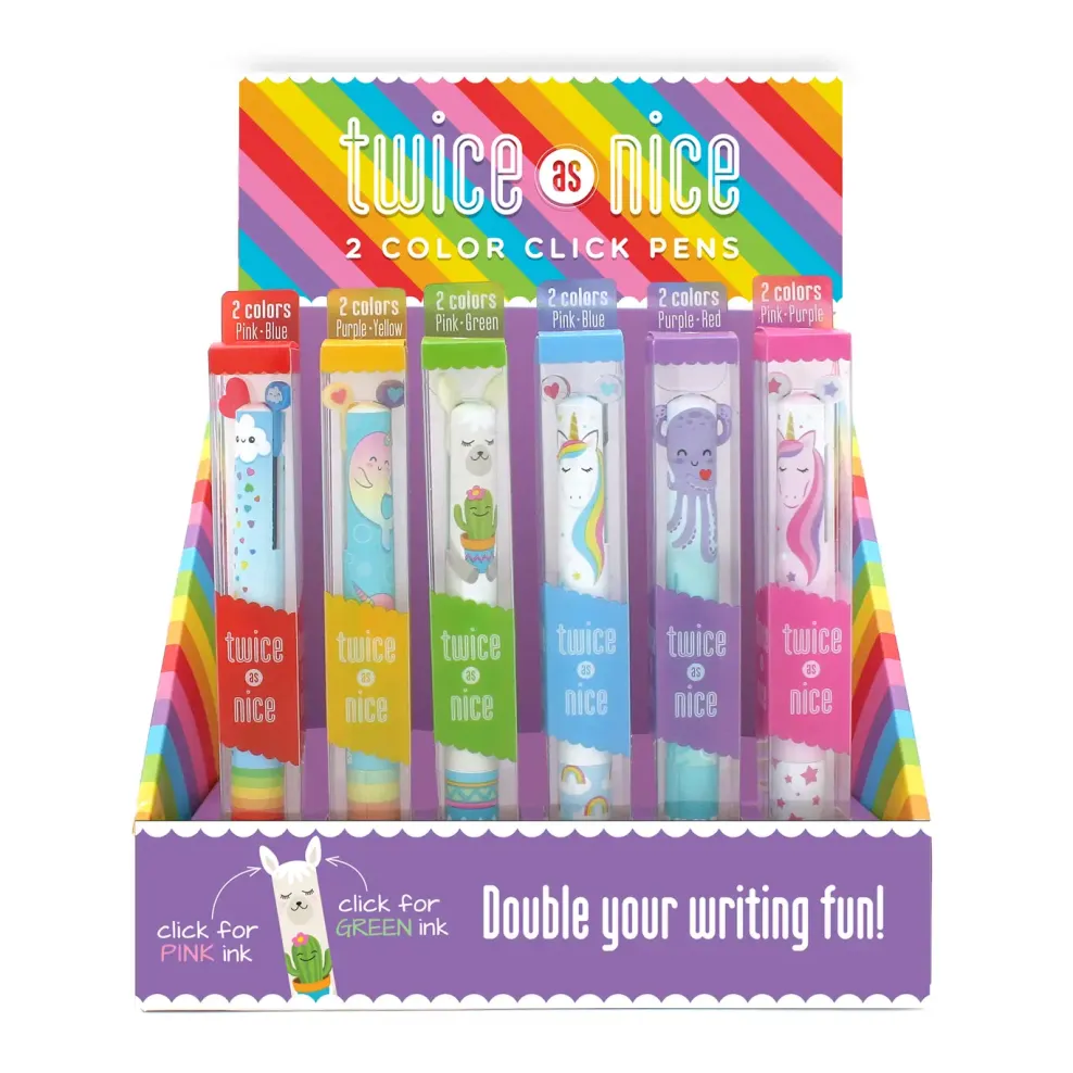 Rainbow 2 color click pens. Each pen writes in 2 different color inks, just click the ears and arms to release the colors. The perfect sweet little pick me up gift!