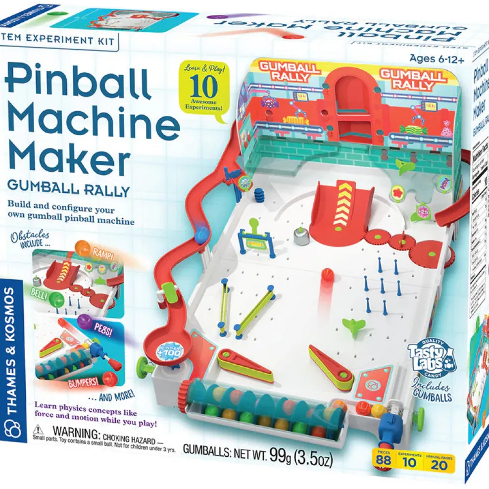 By building and playing with this pinball machine, you can explore lessons in physics and mechanical engineering as you build and play with the pinball machine. Learn about force, motion, collisions, simple machines and more. Includes approximately 45 delicious gumballs (99 grams).