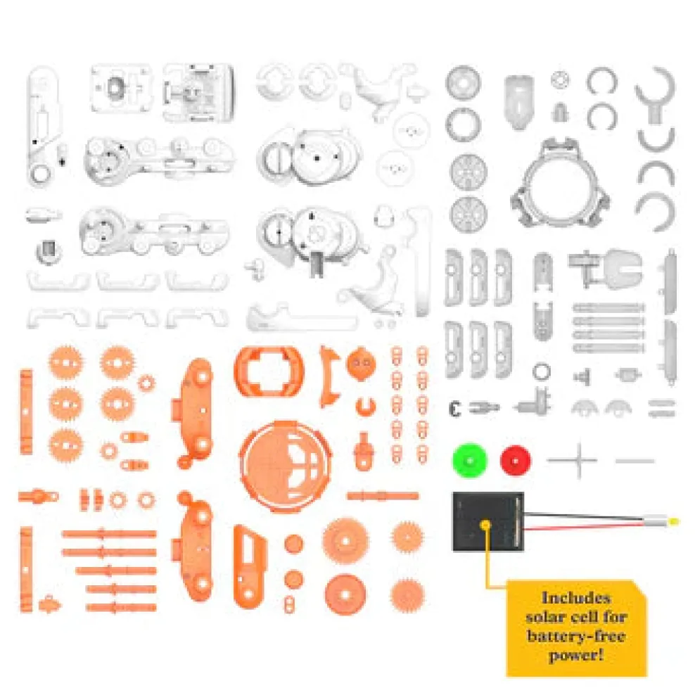 Build five out-of-this-world robots that are powered by the sun — batteries not required! First assemble the main robot, Helio, complete with solar panel, electric motor, and gear wheel. Then construct four space exploration vehicles to help Helio travel around the universe. As you quickly move Helio from one vehicle to another, the gears click into place, and the compact solar panel instantly begins converting sunlight into electricity, which powers the electric motor.