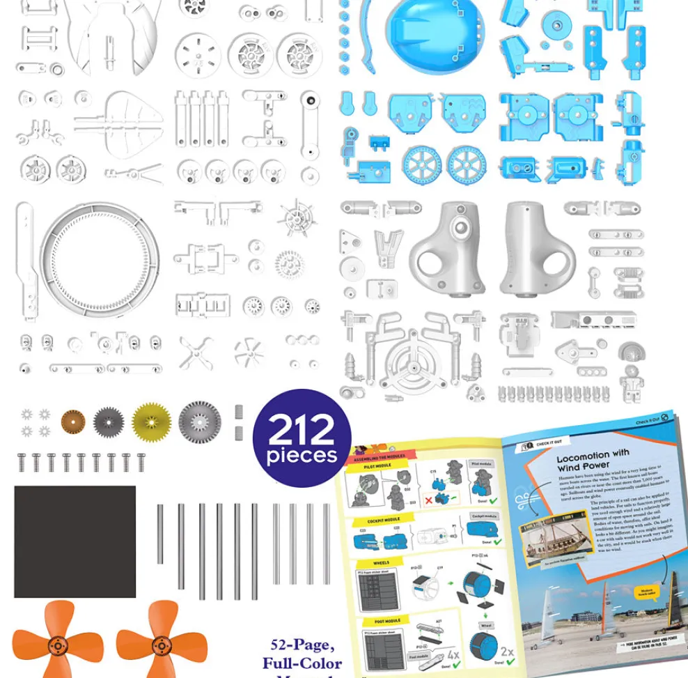 Build a big-wheel tricycle, quadruped, soaring machine, drilling monster, walking robot, and even a wind-powered yacht. To make them all go, the kit also includes the pieces to build a hand-powered wind generator. As you build and experiment, you will learn about how gears transmit power and torque. Also learn about wind as a power-generating technology — past, present, and future.