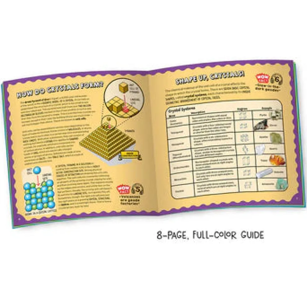 A fun, eight-page, full-color experiment guide takes you through cracking open the geodes and provides exciting educational content about these amazing natural wonders. Scan the QR code to access exclusive podcast content including scientific info about how geodes form and fascinating facts about geodes, all explained by Wow in the World’s Guy Raz and Mindy Thomas! The kit also includes a magnifying glass and a pair of safety goggles to add to your collection of classic STEM tools.