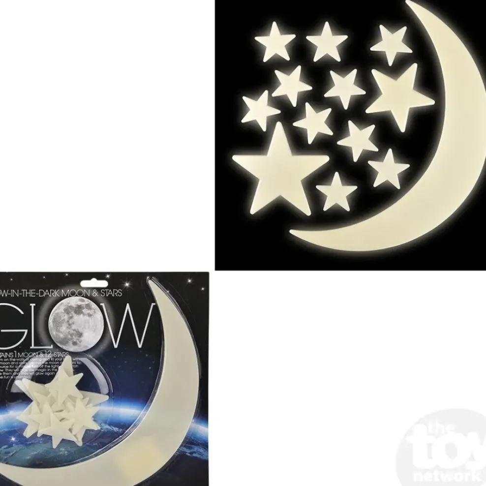 Easily stick these Glow-In-The-Dark Moon & Stars to any wall or ceiling. Great for room decoration. Contains 12 stars and 1 large moon stick-on.