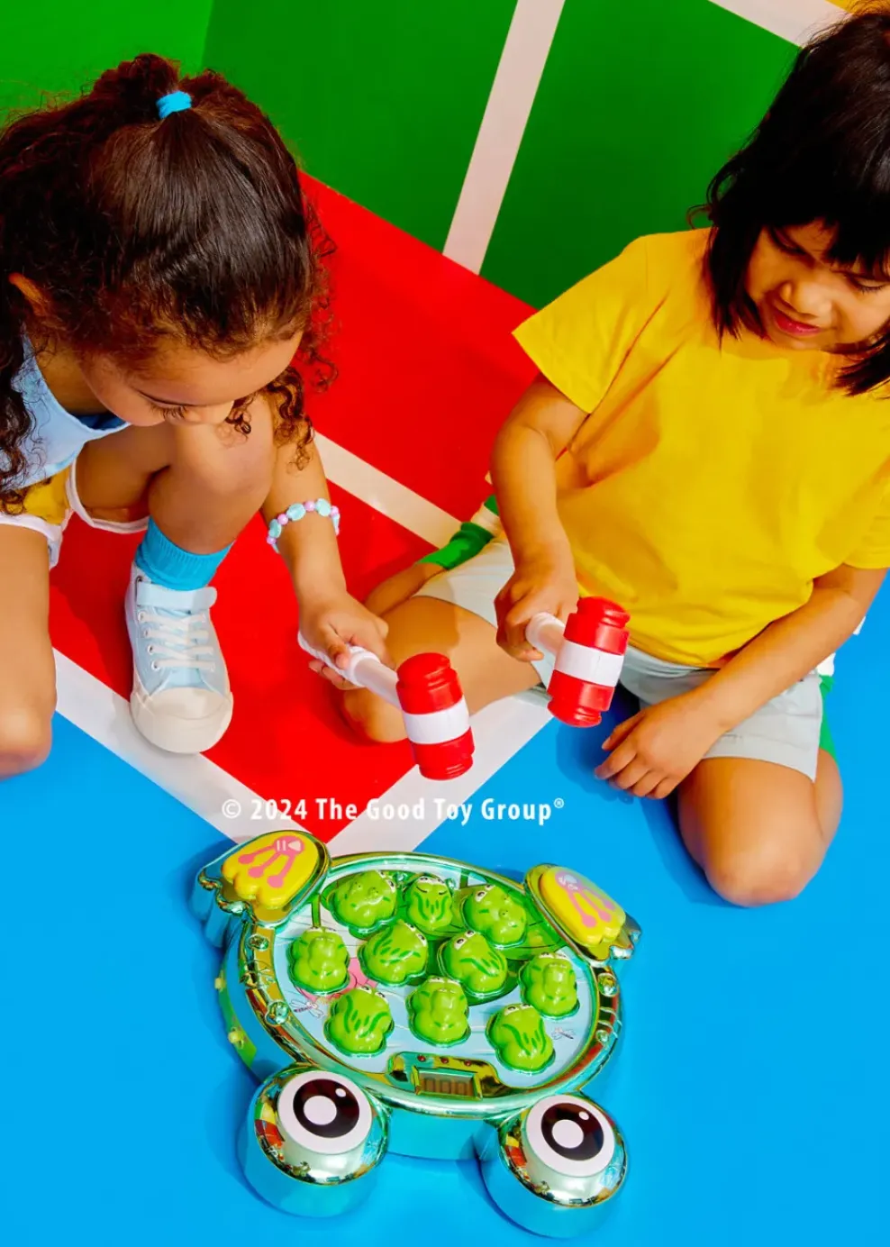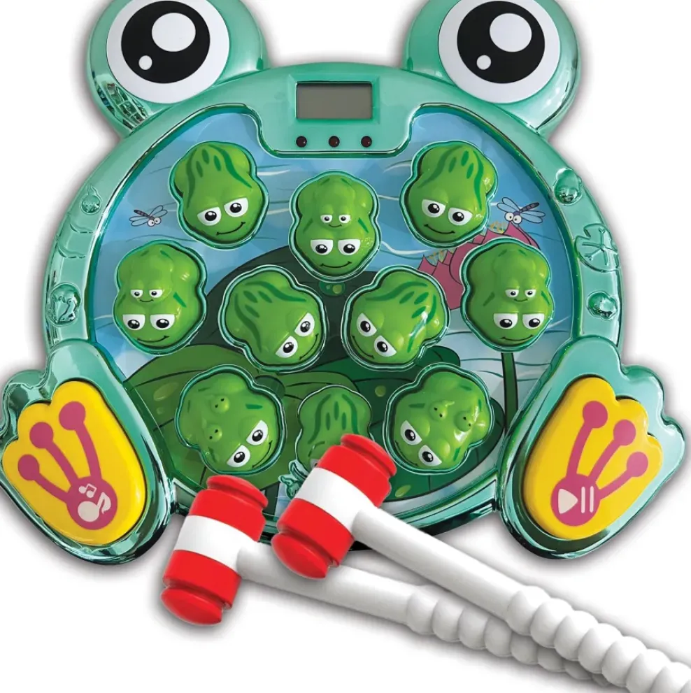 Embrace 80’s nostalgia with a blast from the past: Whack Attack Frog Game brings retro arcade games to you! Kids release extra energy as they follow the flashing lights to bash the heads of funny-faced frogs with the 2 soft rubber hammers. Play in solo or 2-player mode, and LCD scoring keeps track of the arcade champion against a soundscape of croaking, ribbeting music effects. We love that it’s solidly built, and is great rainy day or pre-dinner entertainment. Requires 3 AA batteries, not included.
