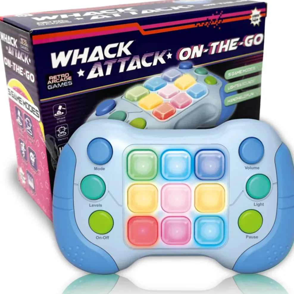 Embrace 80’s nostalgia with this handheld version of a blast from the past: Whack Attack! Kids (and adults!) release extra energy and build focus as they follow the flashing lights in 5 different 1-player games. Choose from hamster, memory, chase, light, and music modes. Volume and lights are adjustable and players can even pause the game! Great after school, travel, or pre-dinner entertainment. Requires 3 AAA batteries, not included. From THiN AiR Brands, for ages 4+ yrs.