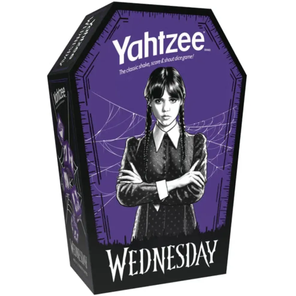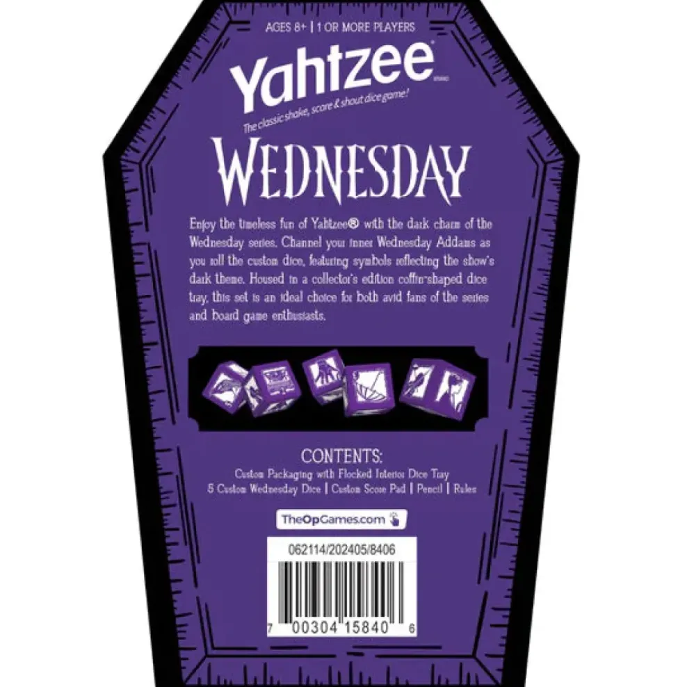 Enjoy the timeless fun of Yahtzee® with the dark charm of the Wednesday series. Channel your inner Wednesday Addams as you roll the custom dice, featuring symbols reflecting the show’s dark theme. Housed in a collector’s edition coffin-shaped dice cup, this set is an ideal choice for both avid fans of the series and board game enthusiasts.