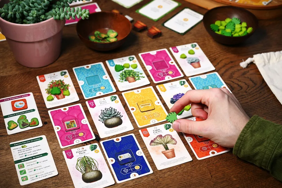 VERDANT is a puzzly spatial board game for 1 to 5 players. You take on the role of a houseplant enthusiast trying to create the coziest interior space by collecting and arranging houseplants and other objects within your home. You must position your plants so that they are provided the most suitable light conditions and take care of them to create the most verdant collection. Each turn, you will select an adjacent pair of a card and token, and use those items to build an ever-expanding tableau of cards – your home. You will need to keep various objectives in mind as you attempt to increase plant verdancy by making spatial matches and using item tokens to take various nurture actions. You will also build your ‘green thumb’ skills allowing you to take additional actions to take care of your plants and create the coziest space!