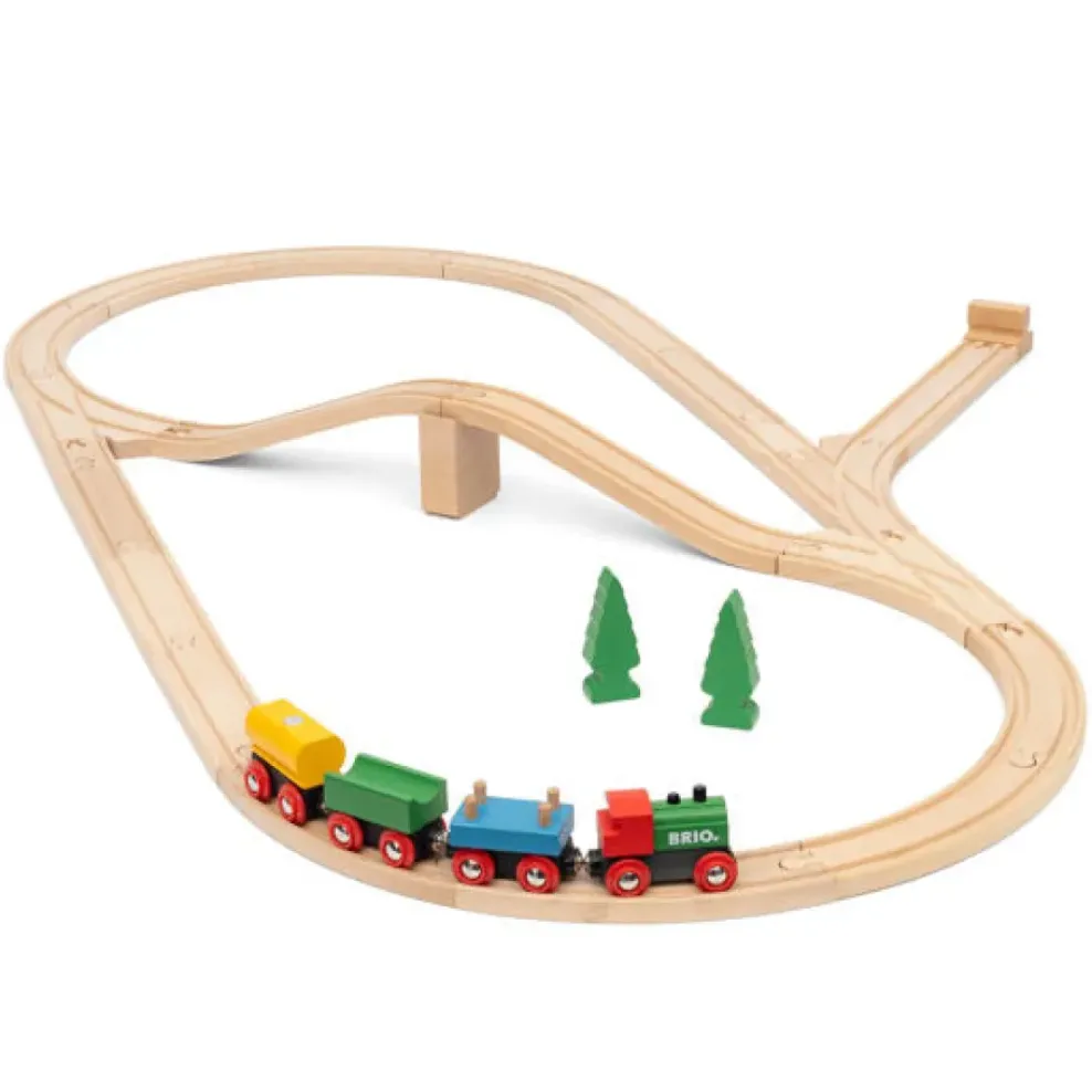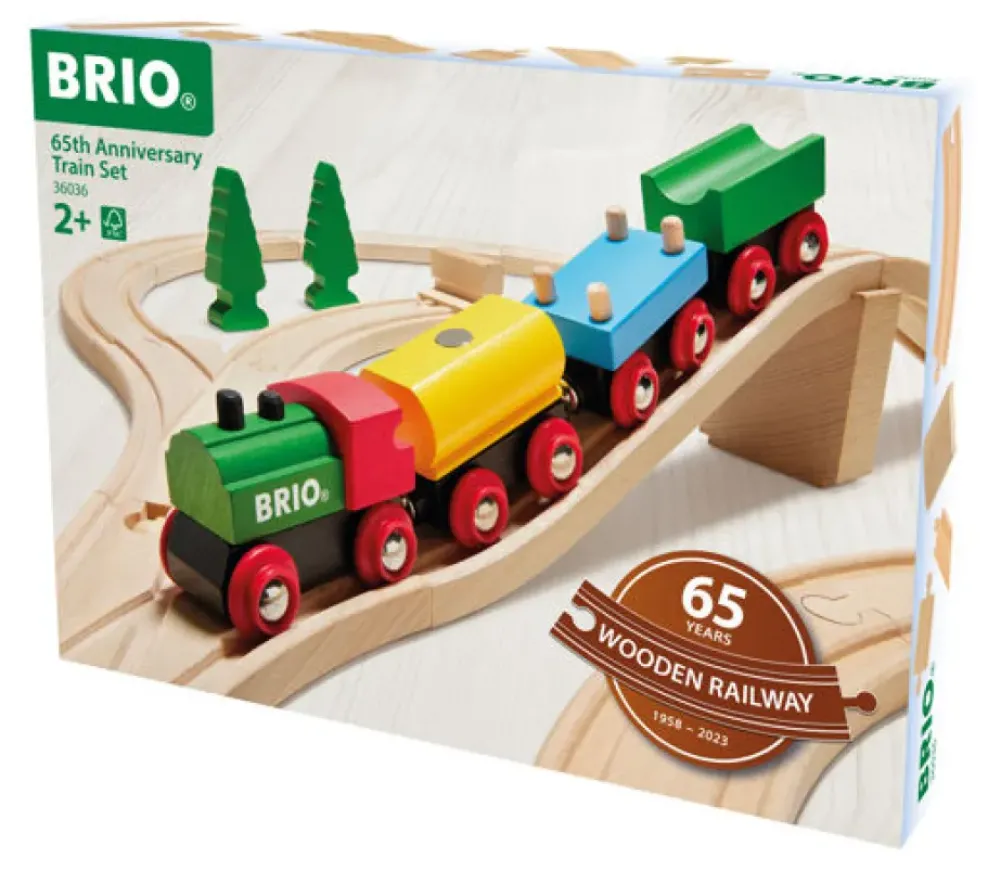 Celebrate classic railway play with the 36036 65th Anniversary Train Set. This all wooden train set takes inspiration from our iconic BRIO railway products first launched in 1958. The 32 piece set is made from FSC-certified European beech wood and includes a classic BRIO train with 3 wooden wagons in bright colors, bridge, switching tracks and wooden trees for scenic decoration.