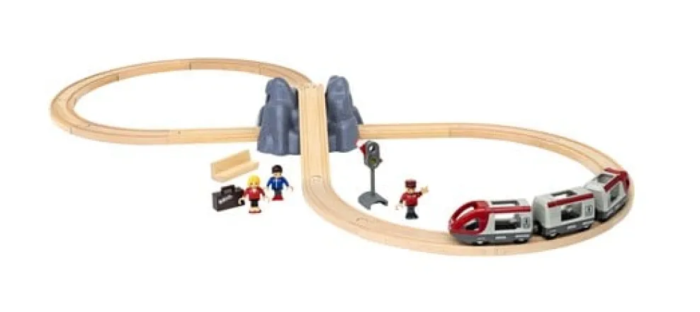 The 33773 Railway Starter Set is everything you need to create your first train set and enter the BRIO World. The 26-piece railway set features a classic figure 8 track layout with a mountain tunnel and bridge intersection.