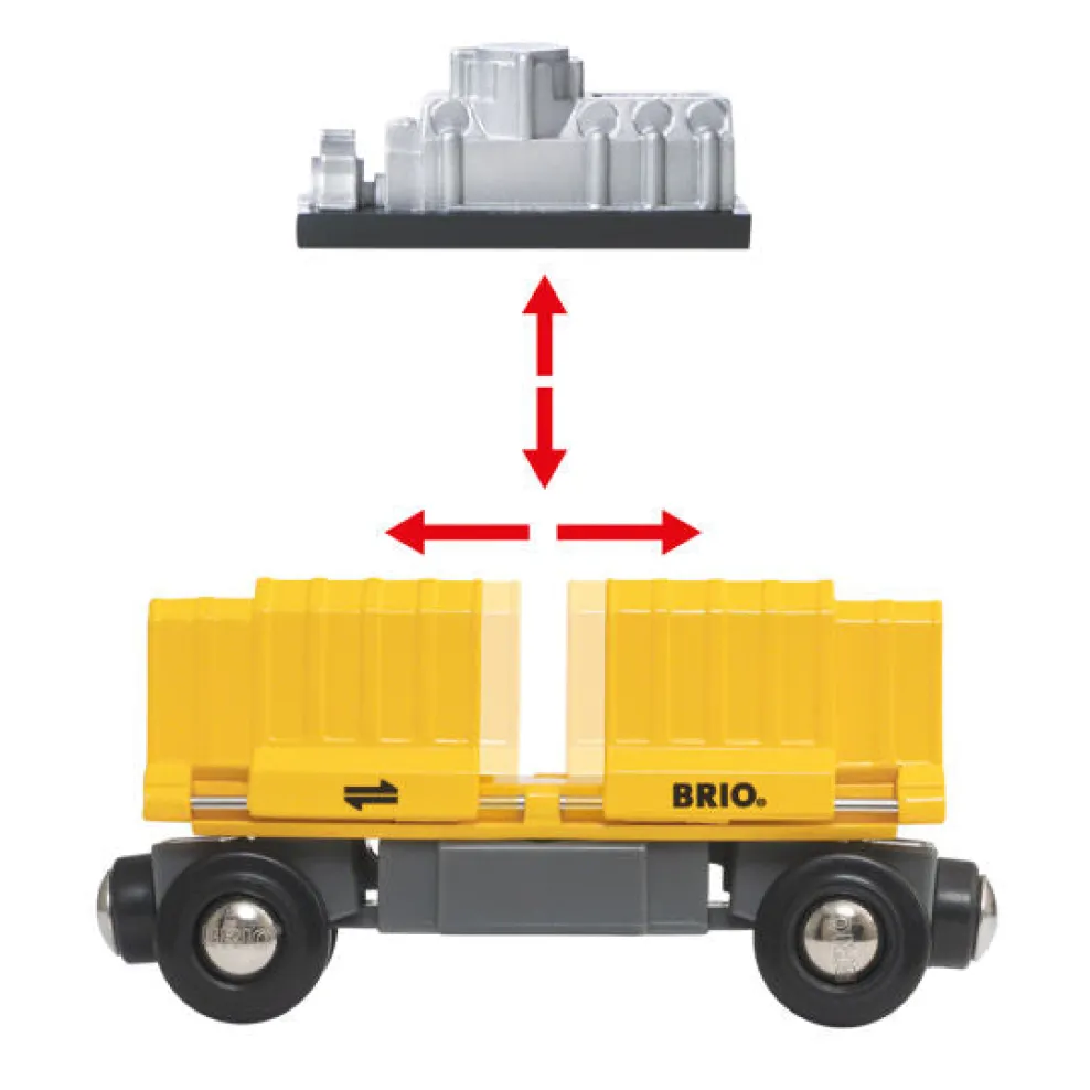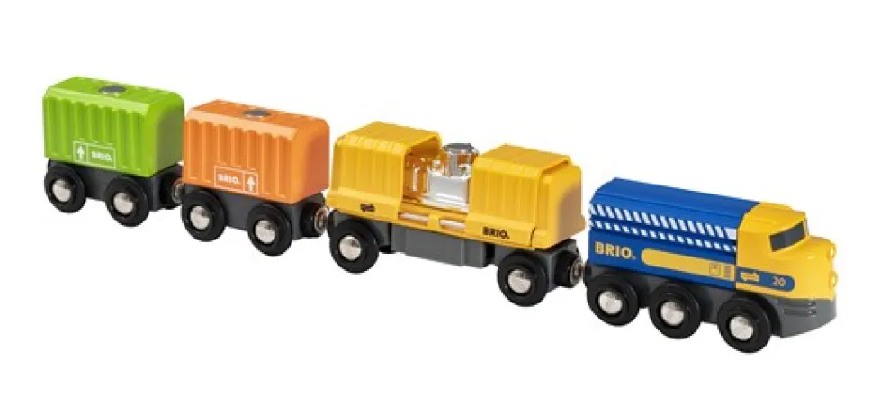 The extra-long 33982 Three-Wagon Cargo Train has just left the station with a lot of cargo in tow. This brightly colored toy train comes with three cargo wagons – two load wagons with orange and light green containers and a special yellow cargo wagon which holds a shiny new engine hidden behind its sliding doors. Featuring iconic BRIO magnetic connections, this cargo train is ready to connect to other BRIO World railway vehicles and wagons and get to work.