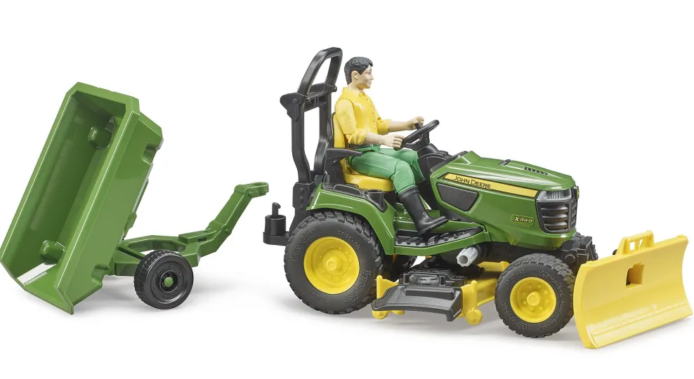John Deere sit-on lawnmowers are ideal for looking after lawns as they are geared towards convenience, comfort and performance. In this context, the John Deere X949 stands out with extraordinary operating and driving comfort. This sit-on lawnmower is the most recent addition to the ample range of commercial and municipal vehicles by BRUDER. This very detailed model features the roll bar and modern cockpit so typical of this model. The triple mowing unit is height-adjustable and can be removed. This set features a tilting trailer that can be quickly and easily attached to transport tools and gardening waste. However, a gardener is also included to add to the fun so it is possible to get to work straight away. BRUDER fans can also use the gardener with lawnmower (item no. 62013) as a great addition to this set.