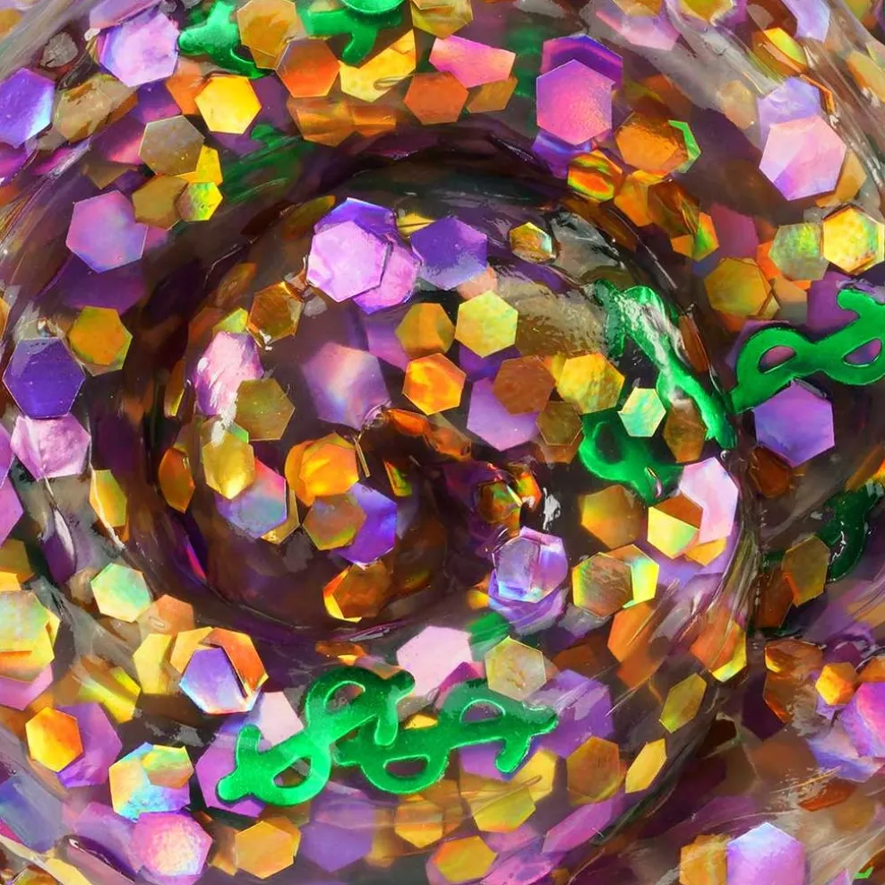 • Color: Gold and purple glitter with green dollar signs | Texture: Soft