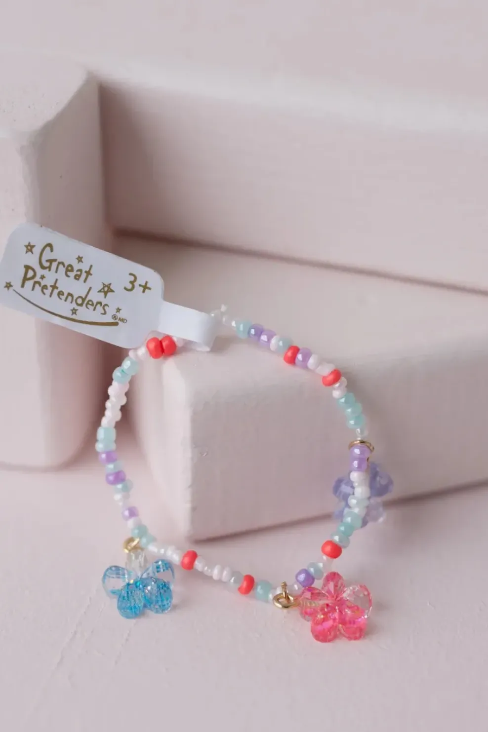 Our Boutique Shimmer Flower bracelet is a cute, delicate, and stylish accessory for any child This delicate bracelet is made with tiny beads and features 3 flower charms in blue, coral, and purple.