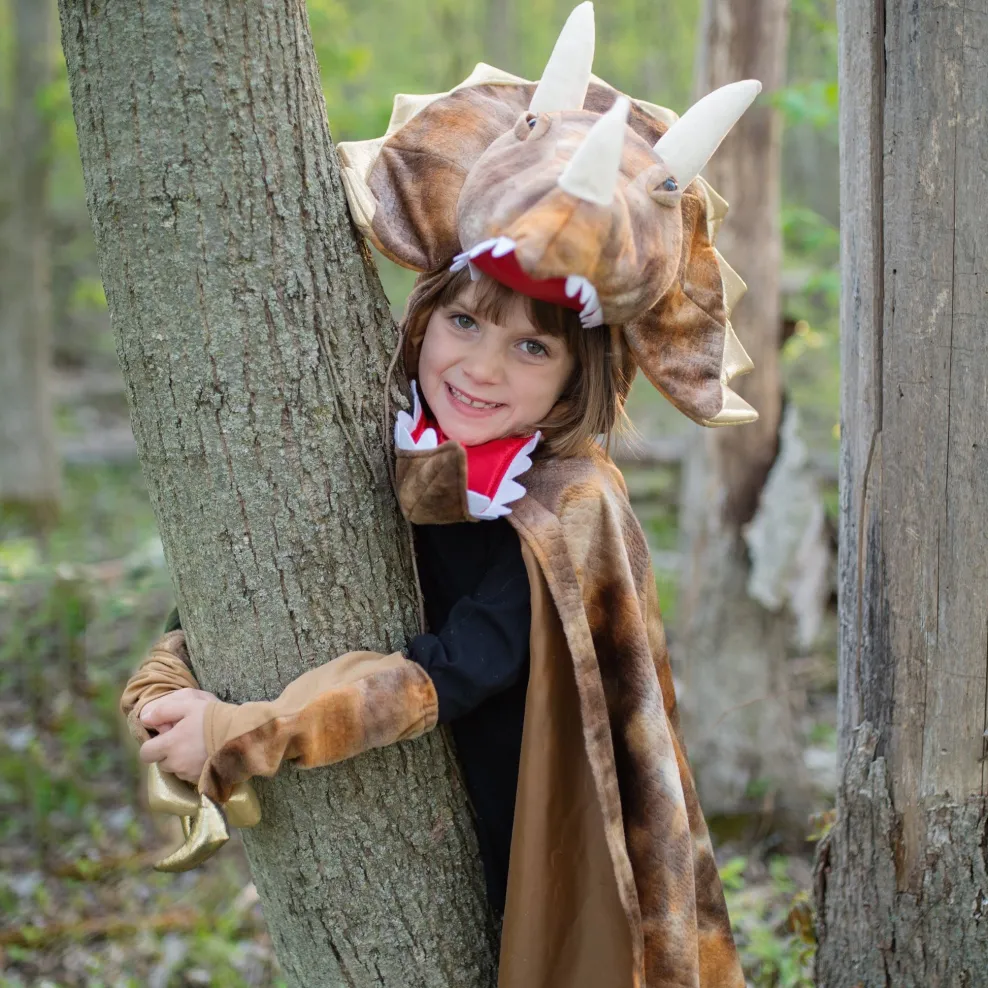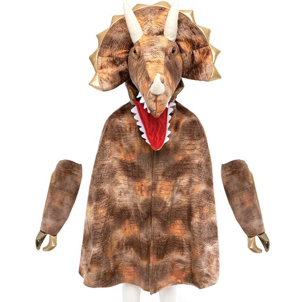 Your child will love this super cute, totally monstrous dinosaur cape! This brown, grey, and orange hand-dyed cape is made with red and brown lining. Detailed with stuffed gold and brown metallic spikes down the back. The dinosaur head has a removable mouthpiece to ensure a secure fit. This is a two-piece set – cape & claws included.