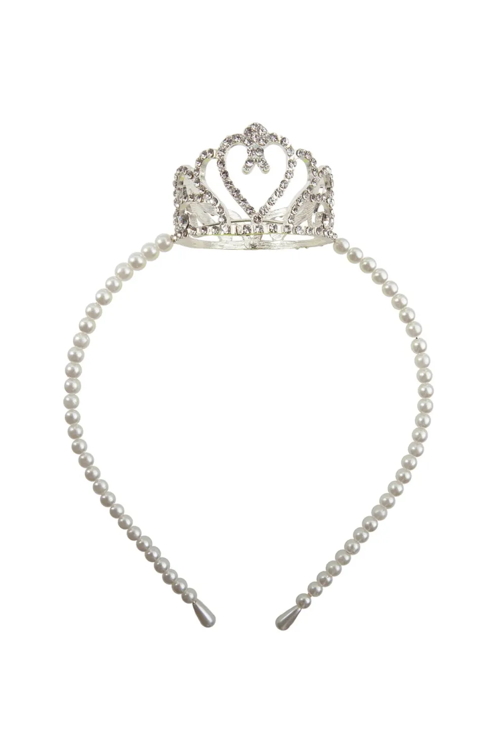 Our Boutique Pretty Petite Crown Headband is beautifully strung with white pearls & a full rhinestone crown centered on the top of the headband.