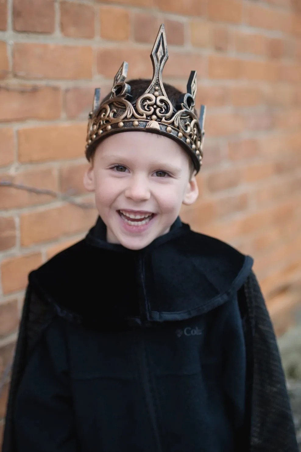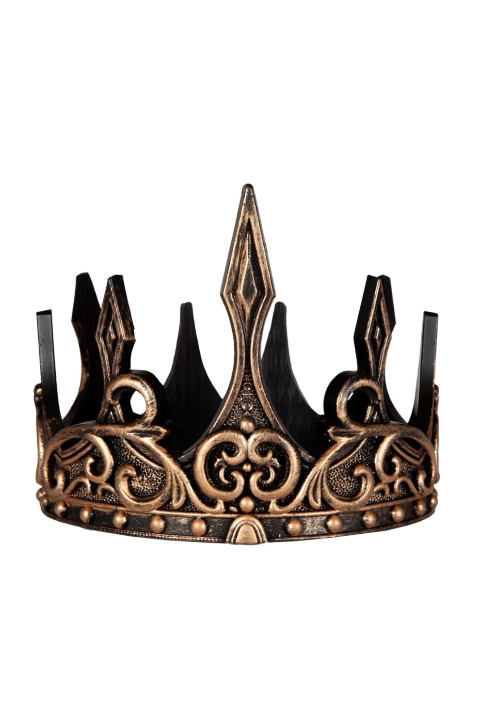 Be the king or queen of the castle with this gold medieval crown. Accented with black, this crown is made from a flexible rubberized/coated EVA foam for extra comfort. These crowns are durable and excellent quality! Size flexible from kids to adults with sewn in Velcro.