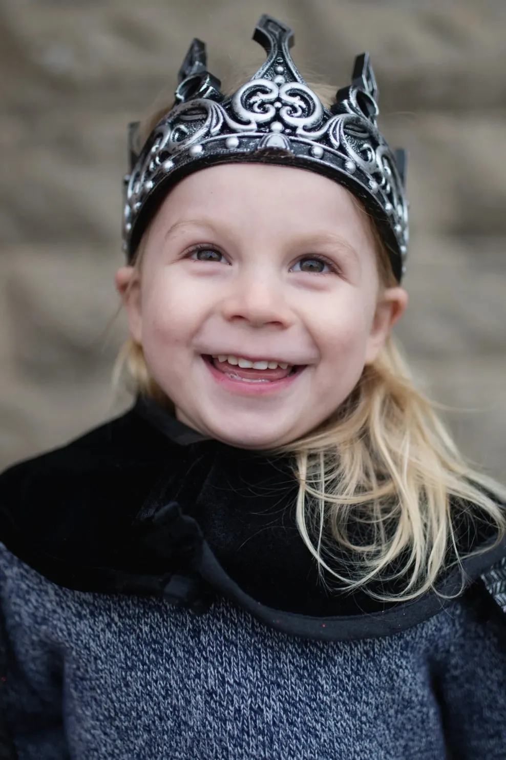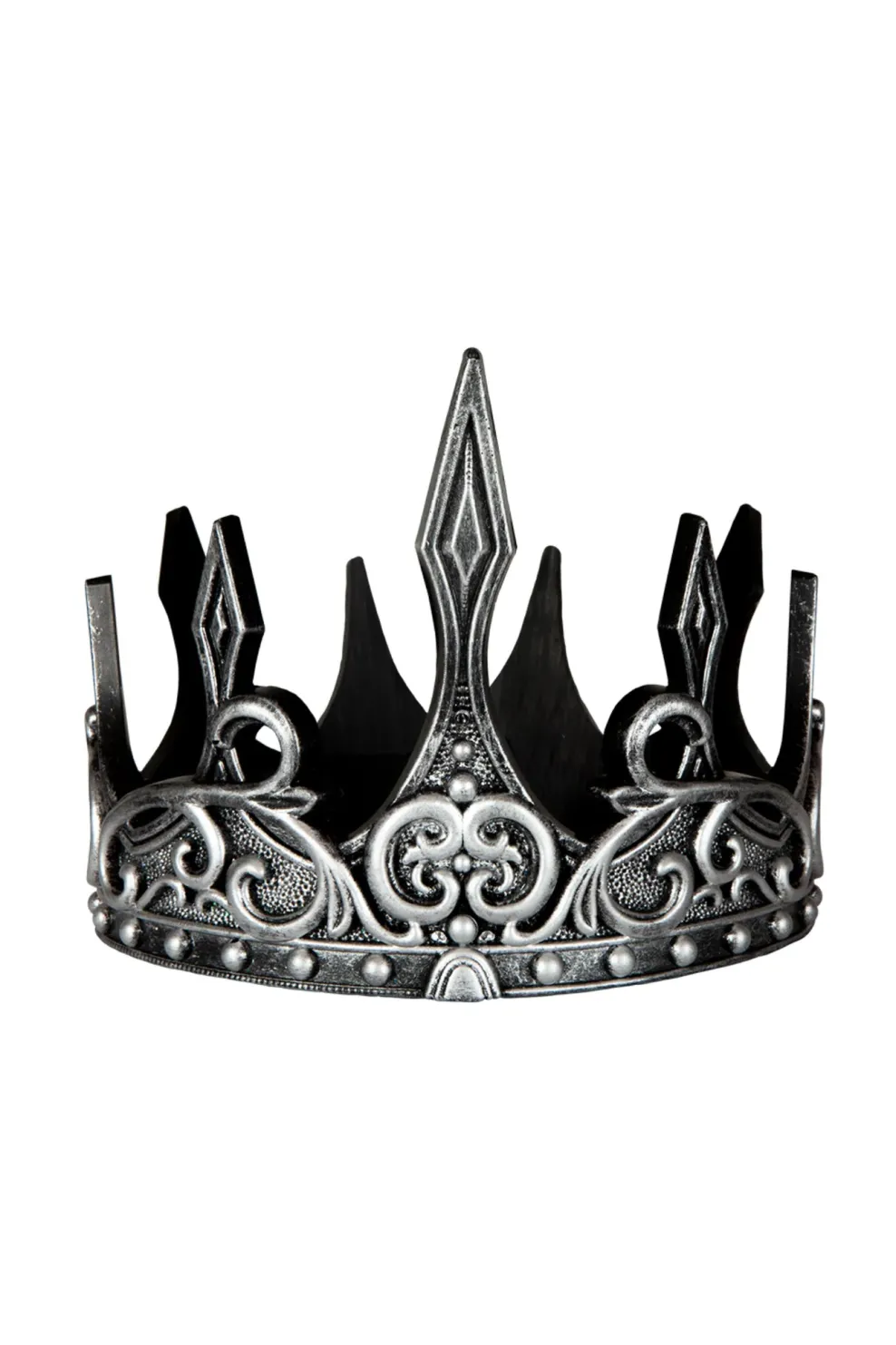 Be the king or queen of the castle with this silver medieval crown. Accented with black, this crown is made from a flexible rubberized/coated EVA foam for extra comfort. These crowns are durable and excellent quality! Size flexible from kids to adults with sewn in Velcro.