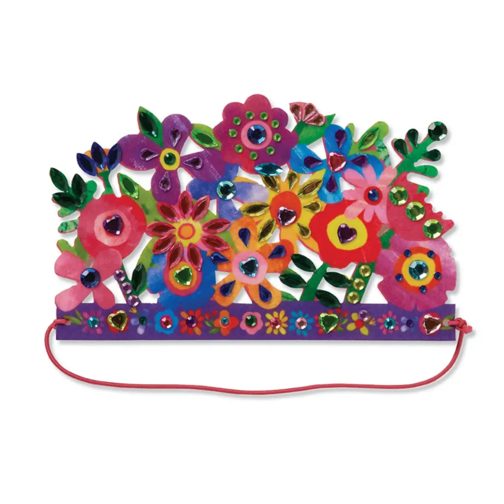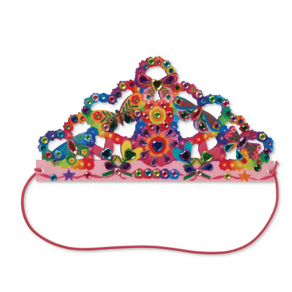 Customize three unique felt crowns with hundreds of mess-free sticky backed gems. Simply peel off the jewels, press them onto your crown, then wear again and again for imaginative play! Each crown is tied with a stretchy elastic band for a comfortable fit.