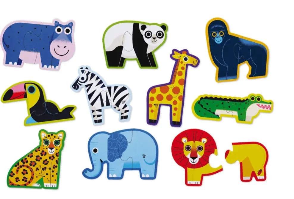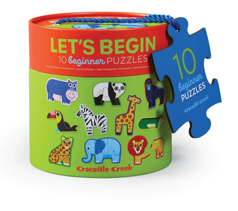 Crocodile Creek’s Let’s Begin puzzle contains ten different 2-piece puzzles that are color coded on the back for easy sorting and color matching. Packed in a wonderful storage canister with a nylon rope handle. Puzzles are 6″W x 4″H and perfect for ages 2+