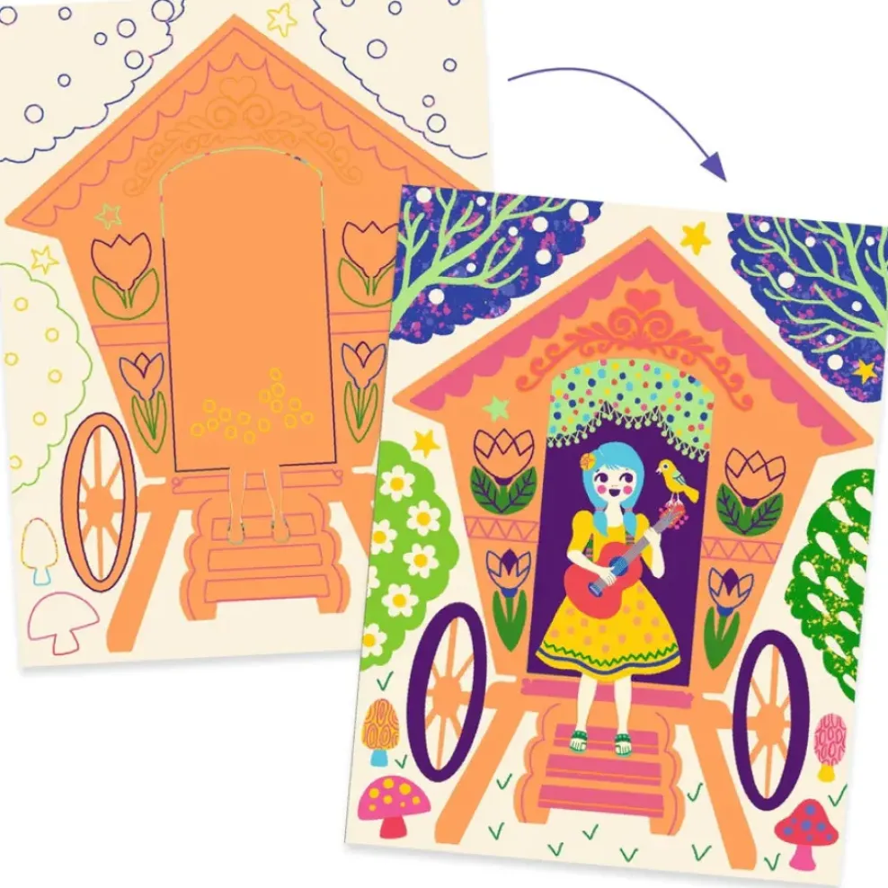 A pocket with 4 dual-color scratch cards that play with the concept of “before and after” and entice you to discover what’s really hiding under the surface. Reproduce the patterns designed by the artist by scratching the surface with the wooden stylus. Gradually, the illustrations are revealed as if by magic!