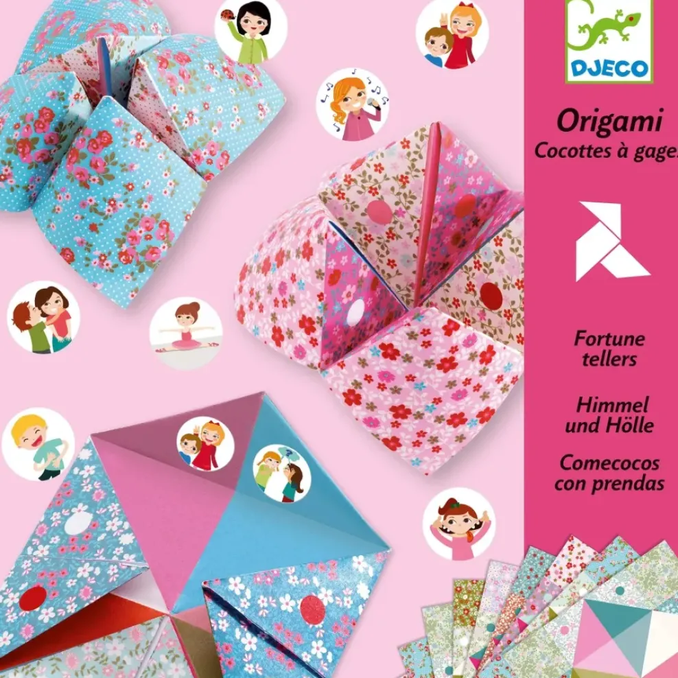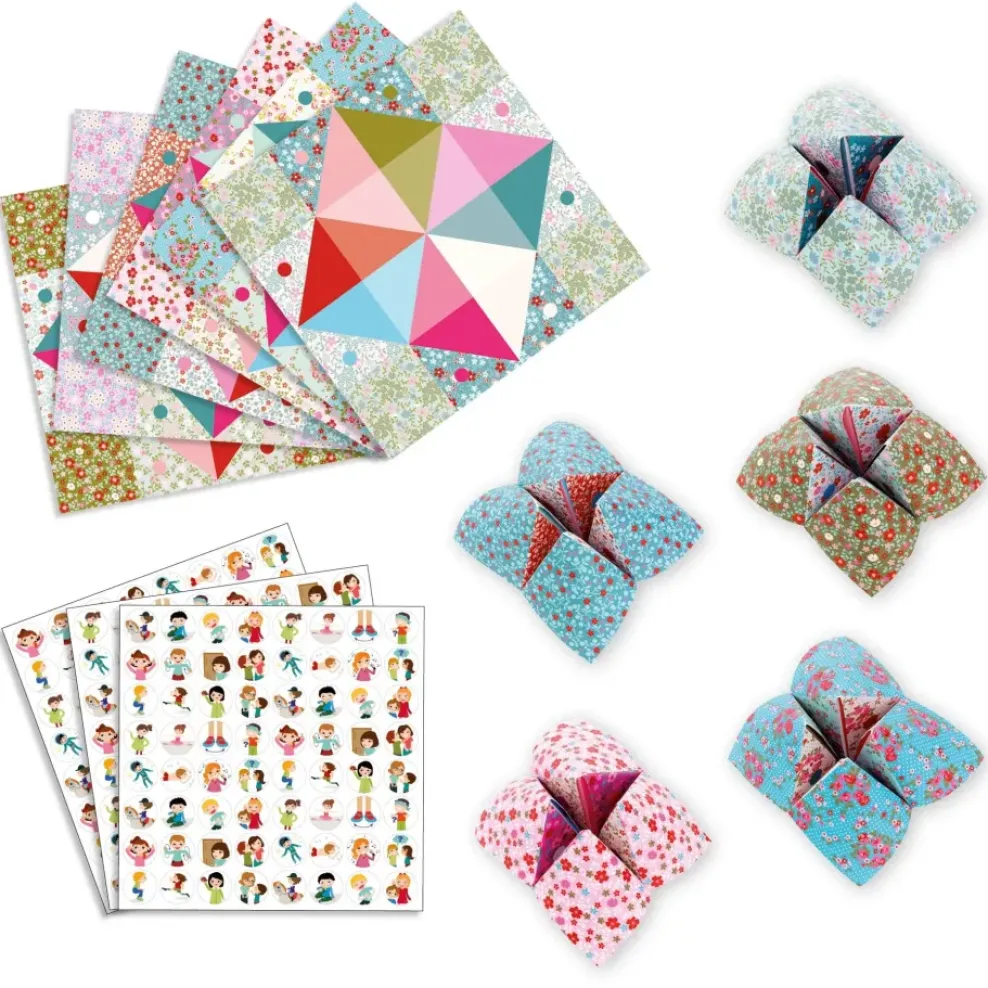 Say a number… Pick a color… This is a playground classic! With this origami set, you can make 24 fortune tellers to play with your friends. Sheets with jolly prints, to be folded in simple steps that are clearly explained in the instruction booklet, as well as 3 sheets of fun forfeit stickers to place under the flaps make for hours of fun!