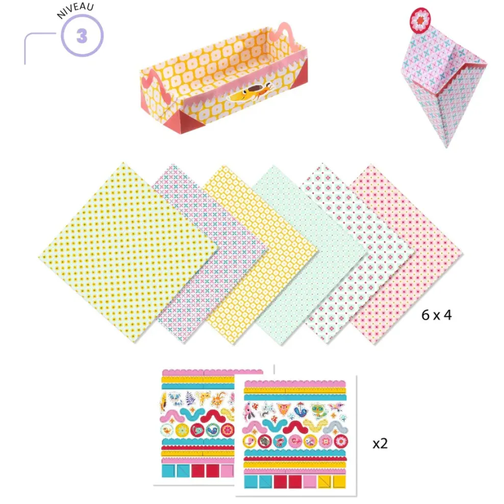 An origami set containing papers with cool, sophisticated prints to create and decorate 24 small boxes. Following the instructions in the booklet, children fold the sheets to make 3 types of boxes! They then customize them with the stickers provided for this purpose.