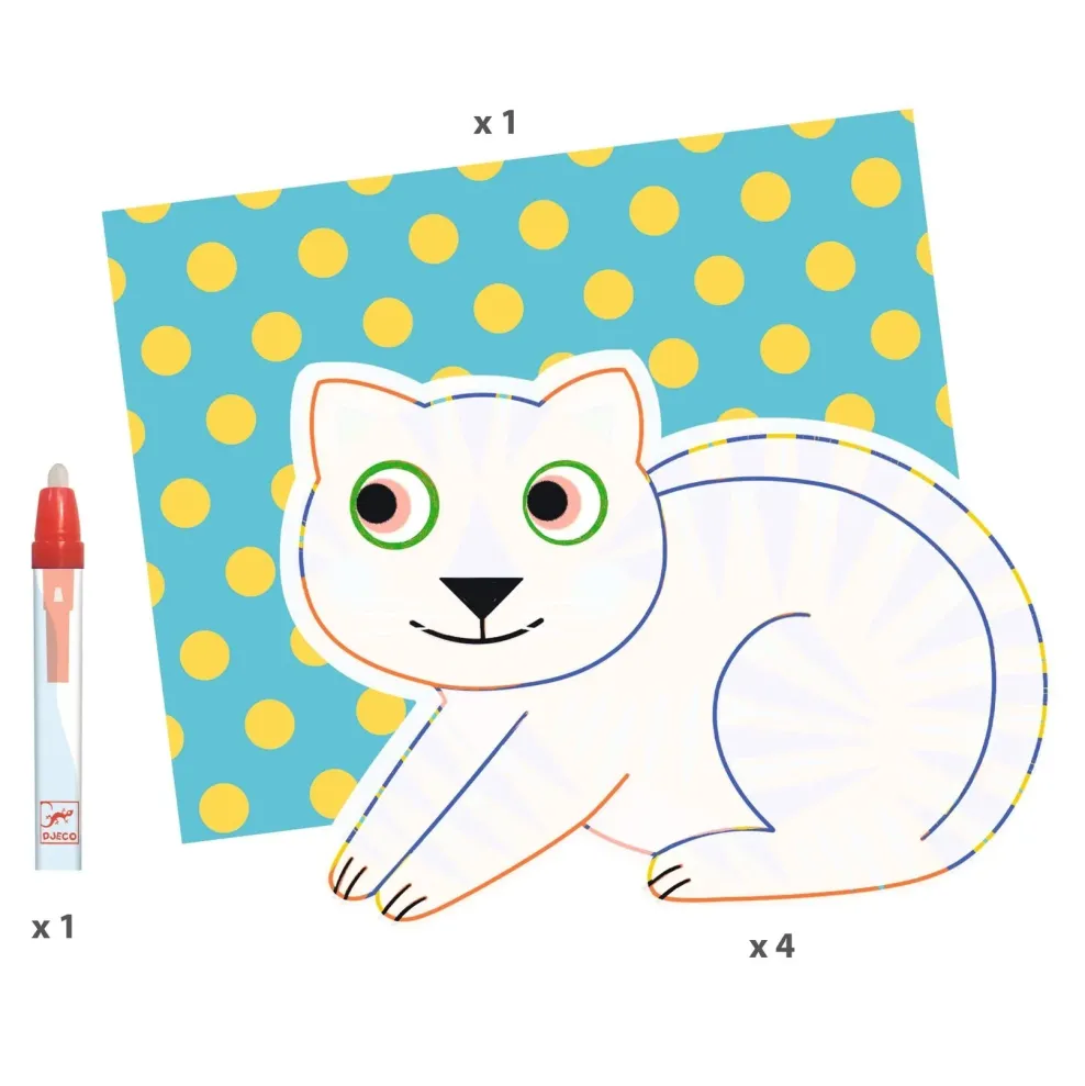 A water-based coloring set specially designed for children aged 18 months and over. Children use the water-filled pencil to color in the white areas of the animals and discover what is hiding underneath. Suddenly, patterns appear and the colors change – it’s like magic! Once the pages are dry, the fun starts all over again!