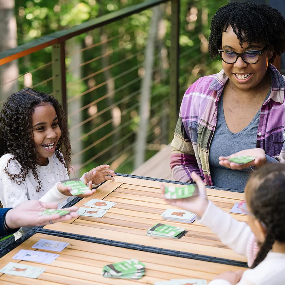 Each player takes a card from the stack. Everyone chants “Moose! Match! Mayhem!” flips their card over and races to grab the best card to make a match. The first player to collect three sets of animals wins!