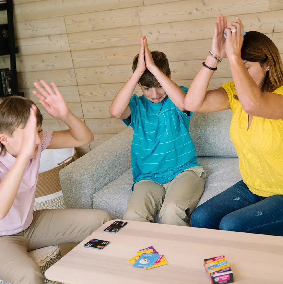 Players take turns flipping over their card while saying, “Wild, Wild, Taco!” When a card played matches the one before it, everyone does the corresponding action and races to slap the pile. The first to get rid of all their cards wins!