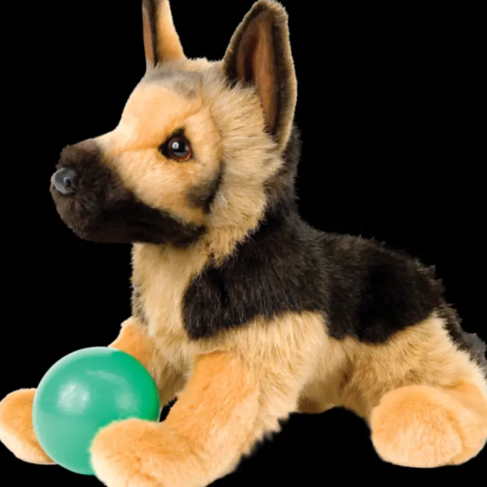 At 16″ long, General German Shepherd has soft and thick tan and black fur, brown puppy dog eyes and a black button nose.
