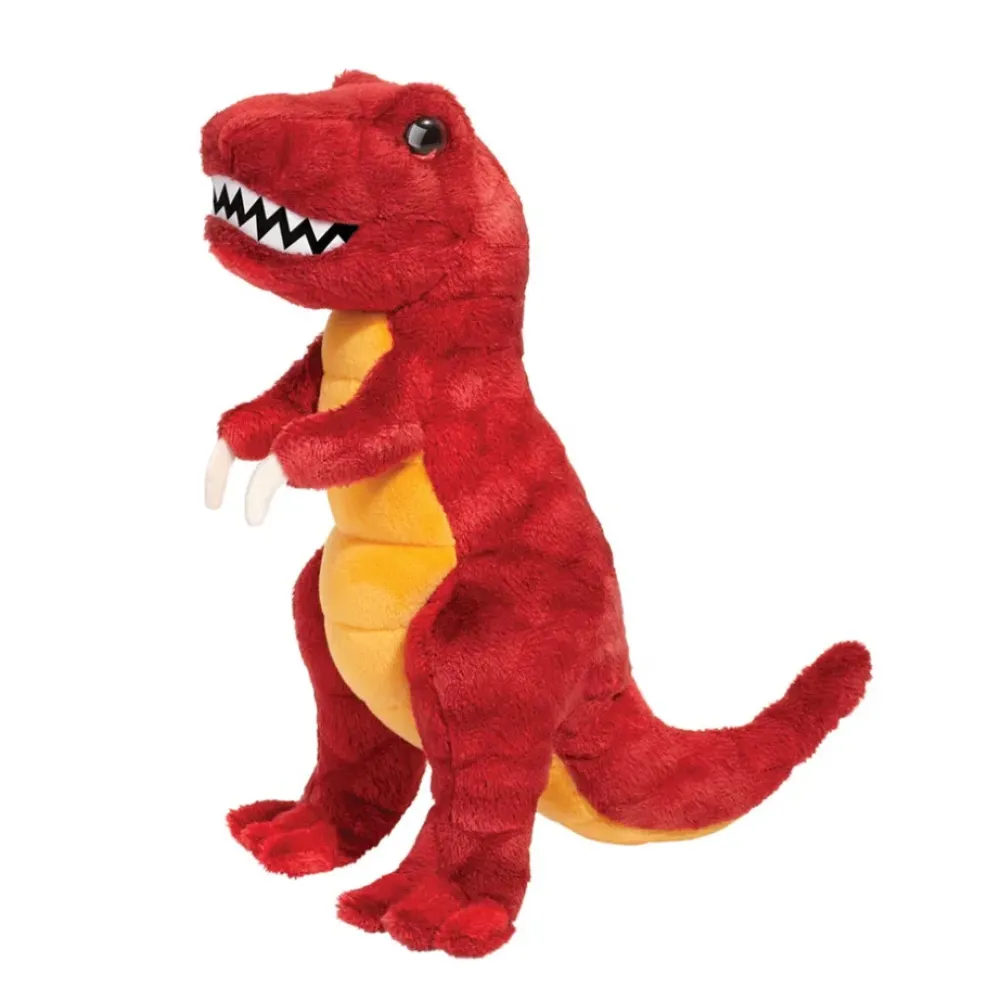 Let Toni the T-Rex stuffed animal ignite the imagination with her flashy looks and toothy smile! Crafted with soft plush materials featuring a red hot hue and a scaly texture, Toni is a cuddly handful of prehistoric excitement. Her yellow underbelly adds brightness to her appearance, while white felt claws detail her hands. An upright stance and a mouthful of jagged, white teeth lend her a fearsome look that will encourage creative play. With a flash of her ruby red eyes, this imaginative Dinosaur stuffed animal will carry you back in time. Surprise the Dinosaur lover in your life with Toni the plush Tyrannosaurus!