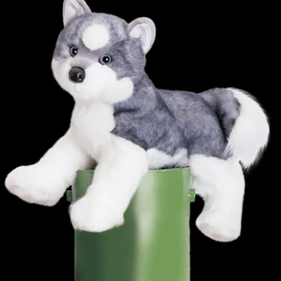 At 16″ long, Sasha Husky has soft and thick gray and white fur, grayish-blue puppy dog eyes, and a black button nose.