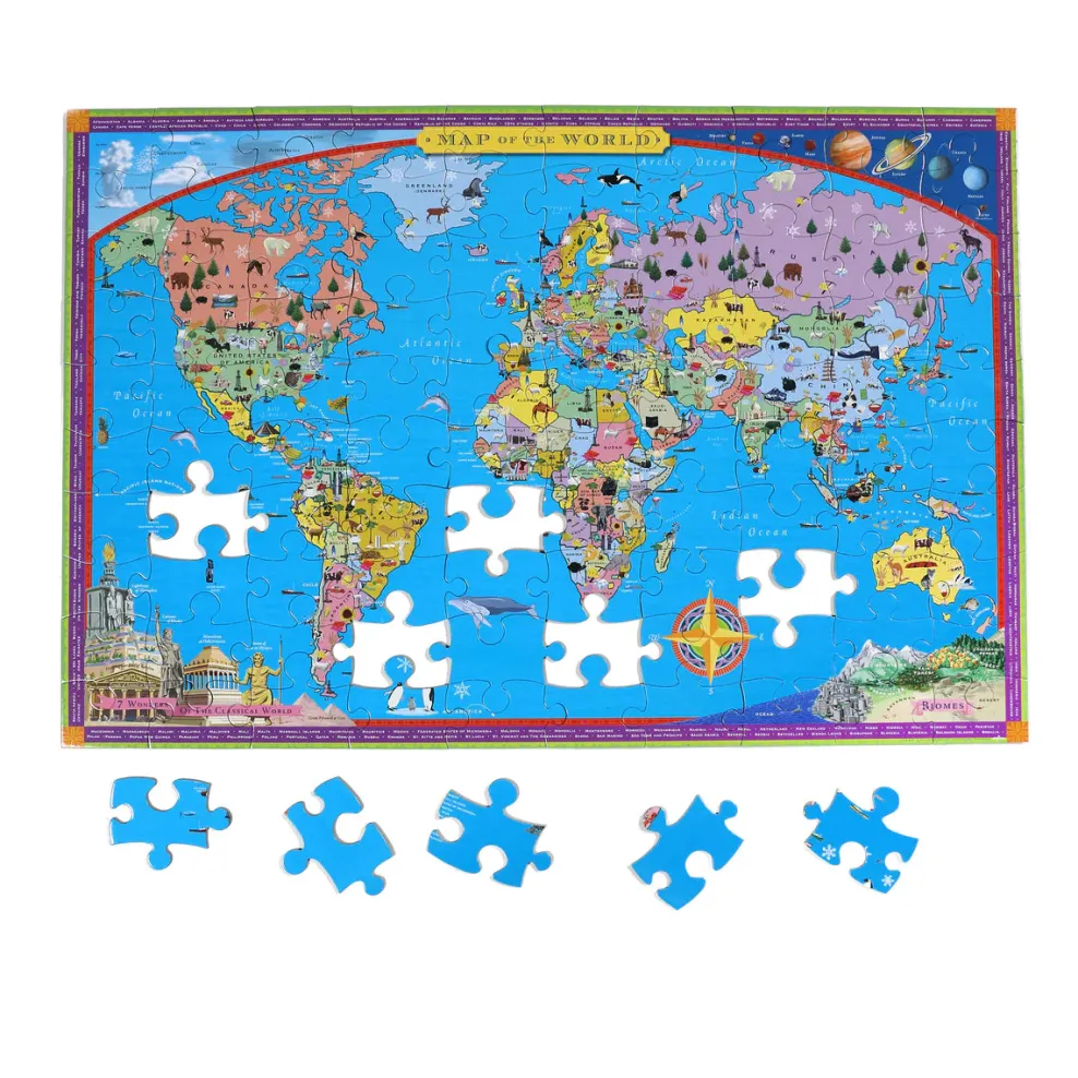 eeBoo’s award-winning World Map 100 piece jigsaw puzzle will provide wanderlust to all ages! Countries and oceans, landmarks and beasts make our world what it is, North, South, West and East. Learning about it can be such a snap if you spend lots of time looking over this map! Also includes a glossary and icons. Illustrated by Saxton Freymann. This educational 27 x 18 inch rectangular puzzle has been thoughtfully commissioned and beautifully designed in an ideal format for transitioning from simple children’s puzzles to more challenging adult jigsaw puzzles. They offer a screen-free, relaxing way to practice patience and concentration while sharing a gentle cooperative activity with friends and family.