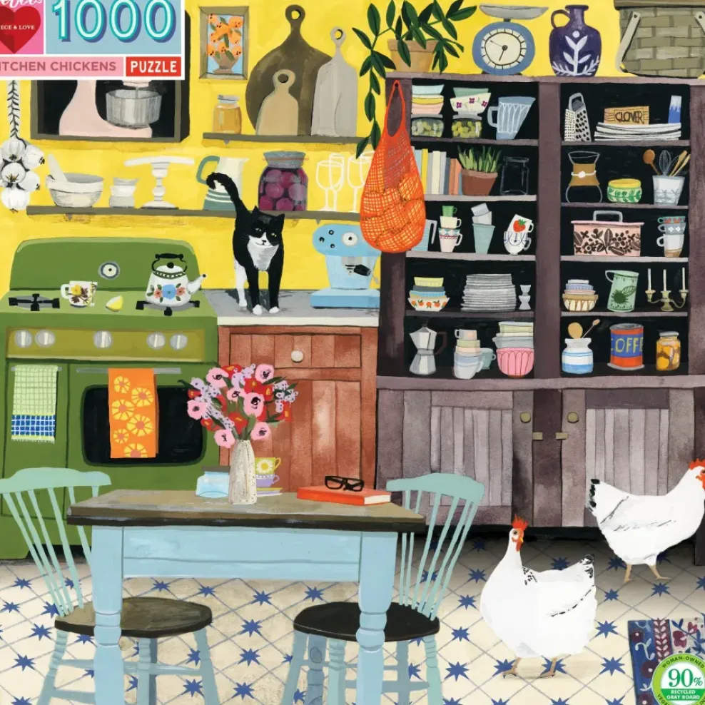 Cluck Cluck Meow! Puzzle your way through eeBoo’s Kitchen Chickens 1000 Piece Puzzle. This charming country kitchen has a few friendly fowl and one curious cat. Jigsaw puzzles are a great activity for the whole family to enjoy. Featuring art by Anisa Makhoul (@anisamakhoul).