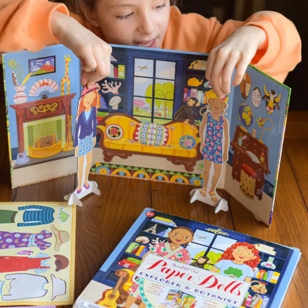 Explorer and Botanist Paper Dolls. A beautiful and educational imaginative play activity. Two brilliant and curious young investigators come with a generously sized fold-out play scene, a wardrobe of reusable electrostatic vinyl clothes and accessories.