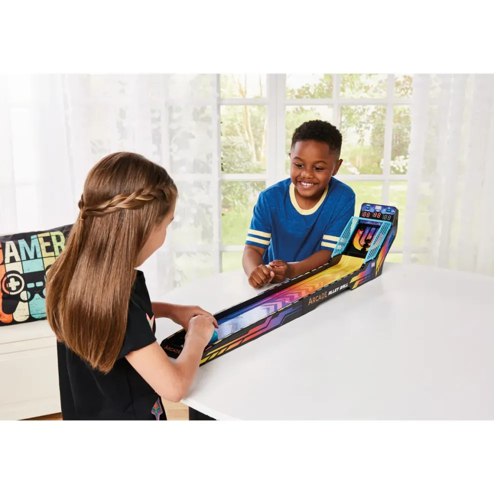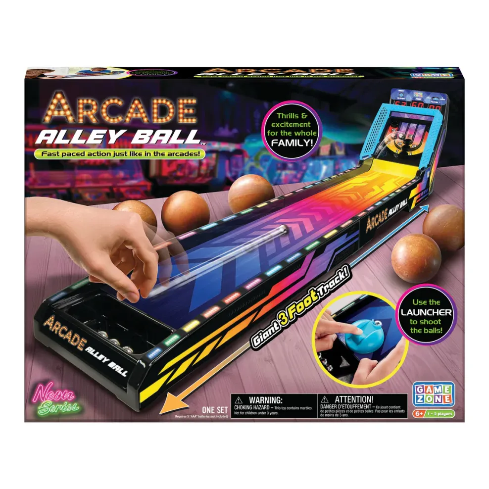Bring the thrills & excitement of the classic arcade Alley Roller home with the Electronic Arcade Alley Ball game! Just like the arcade version you need to roll the balls down the alley, up the ramp, and into one of the target holes to score points. Each target hole has a different value, so take careful aim and send the ball flying down giant 3-foot (95cm) long track to build up your score. Includes 2 playing options – classic arcade style, in which you aim and roll the ball down the track by hand – or switch over and use the spring-powered ball launcher! Also features single player and 2 player modes – challenge a friend to score as many points as possible in 60 seconds. Features a large LED scoreboard with countdown timer and arcade sound effects. For 1-2 players. Requires 3 x 1.5V AAA batteries (not included). Recommended for ages 6 and over.