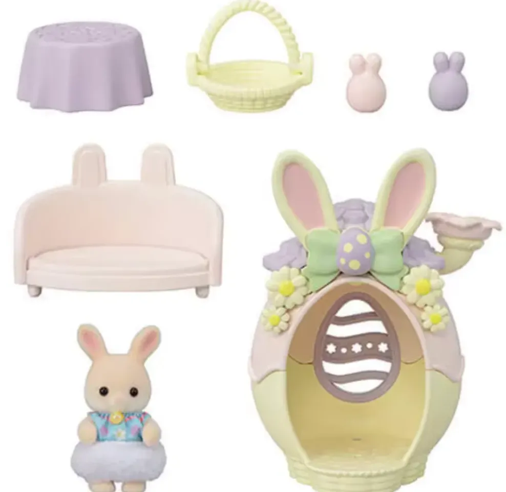 A seasonal product. This set includes the Marguerite Rabbit baby, accessories and a little house with a bunny and Easter egg motif. Hide the rabbit-shaped Easter eggs in places like the chimney and under the tablecloth for an Easter egg hunt. There are egg motifs hidden all over the house and furniture—see how many you can spot! The Marguerite Rabbit baby is wearing a cute Easter-themed outfit.