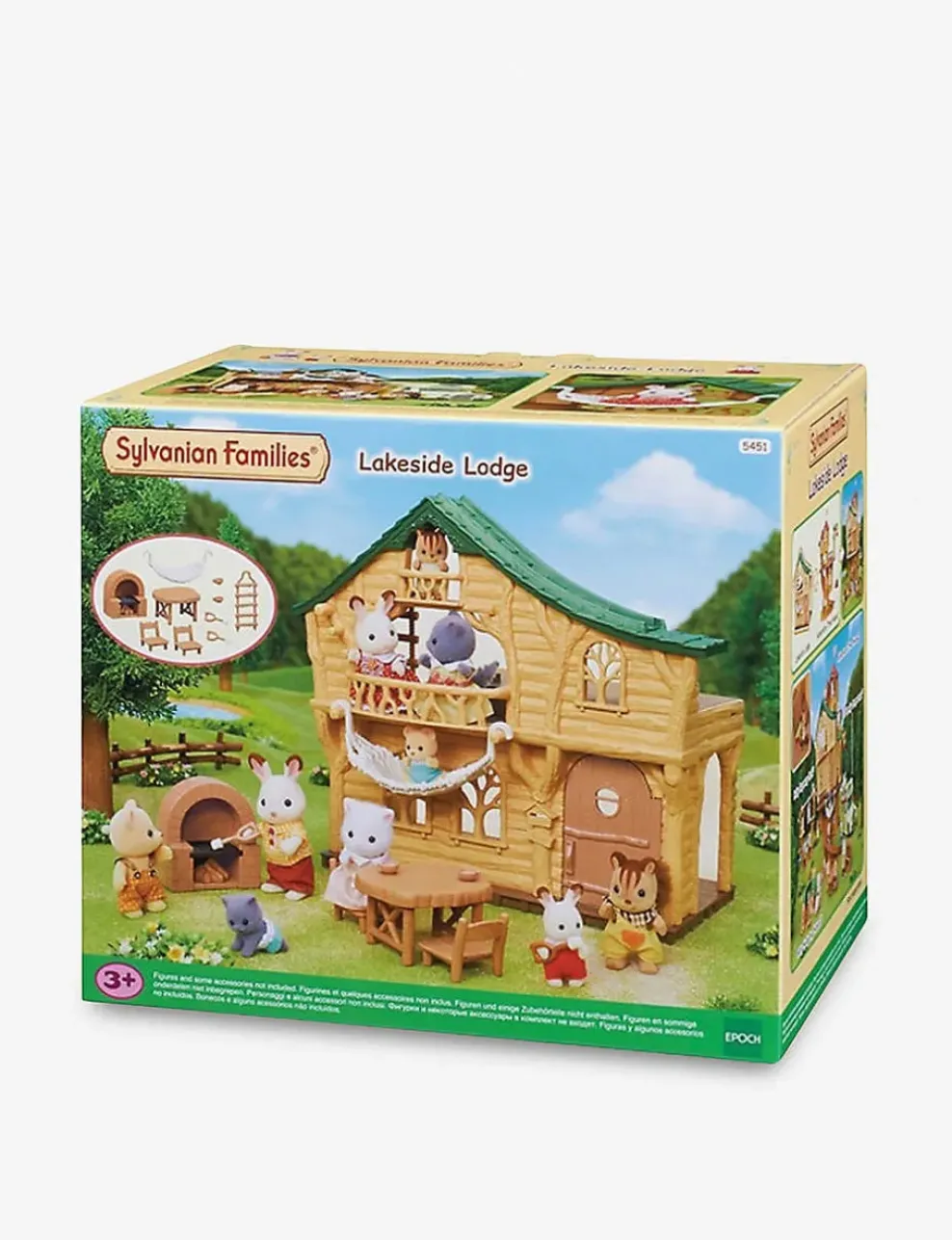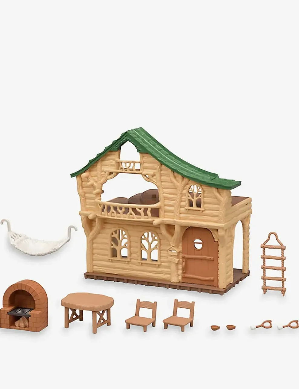 Yellow Labrador baby, lodge, 2 floors, rustic dining table, 2 chairs, brick oven, marshmallow sticks, 2 cups, hammock, slide and rope ladder.